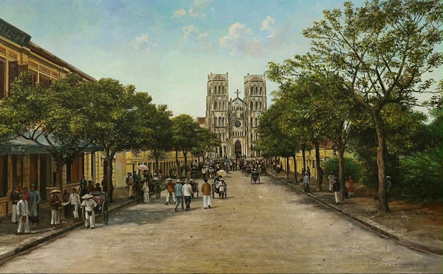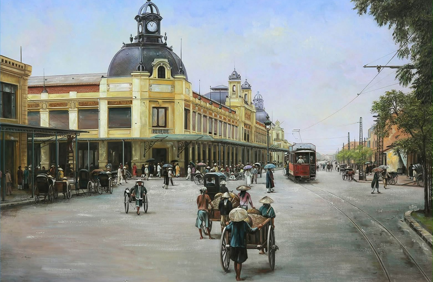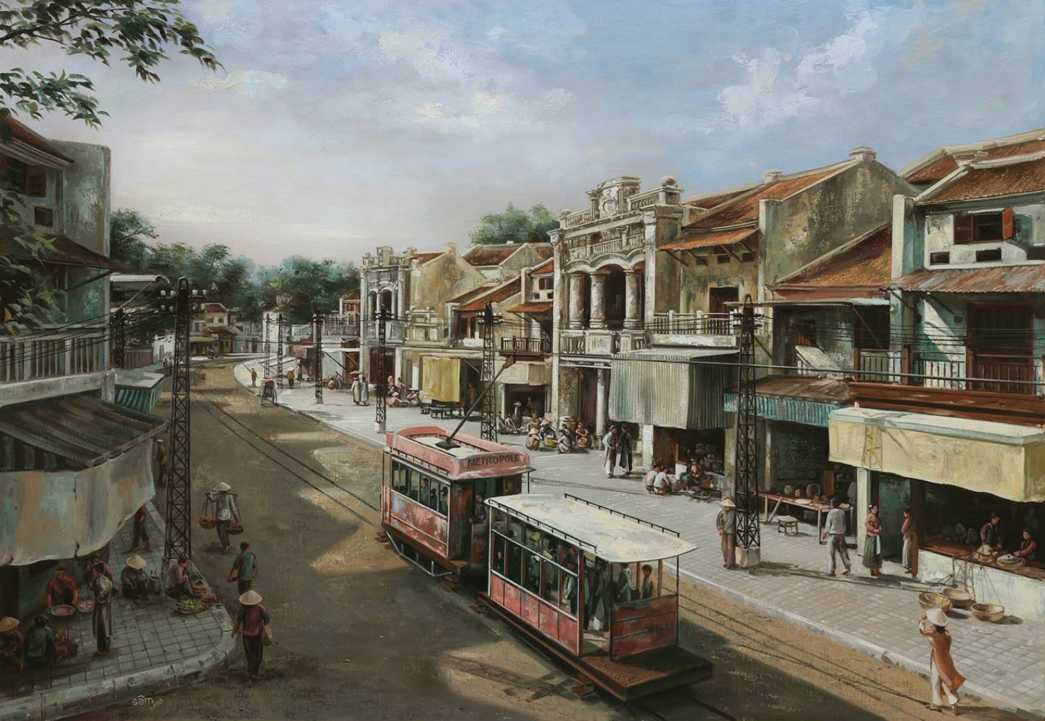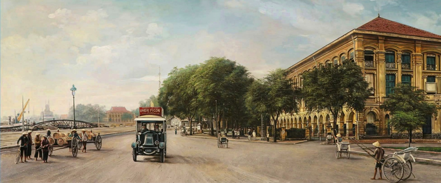 In addition to Saigon, the artist has painted many scenes of Hanoi, such as Nha Tho street in the early 20th century.
