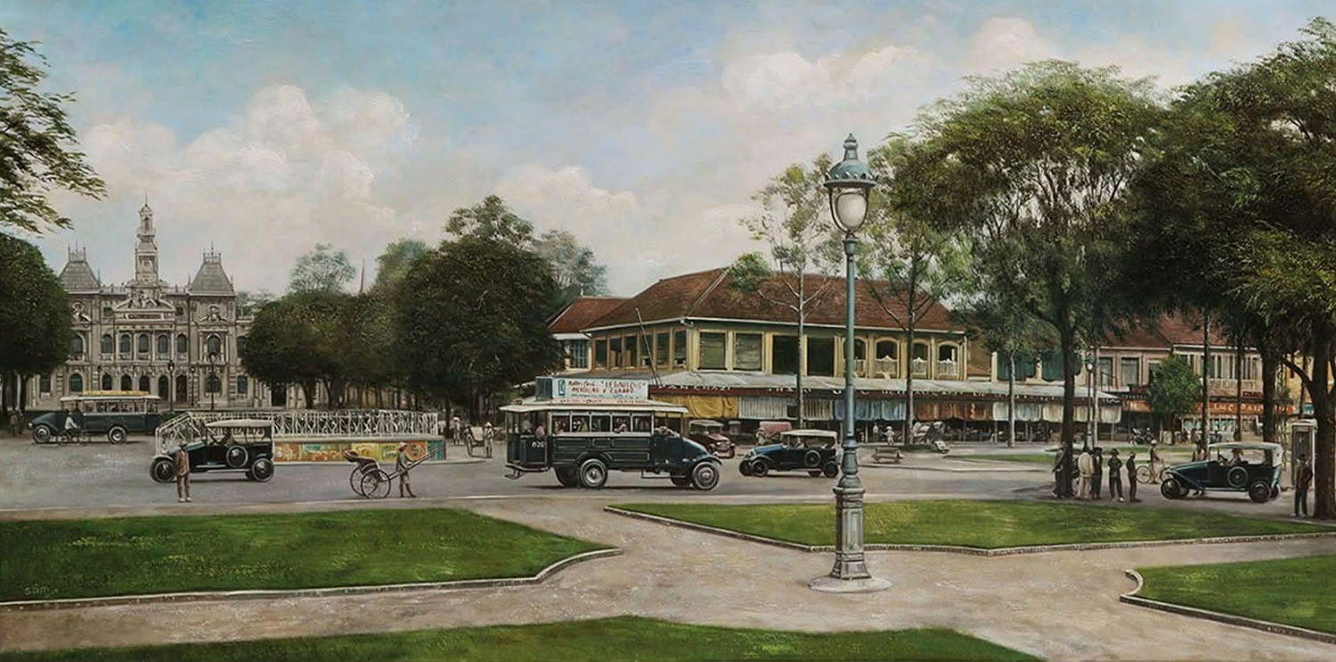 Notre Dame Cathedral in Saigon, bustling with traffic in the late 19th and early 20th century. Artist Le Sam, 53, created this oil painting on canvas from a black and white photograph. He stated that he has pursued the theme of historical life since 2018. Some of his works, shared on art appreciation community pages, have received praise for their vividness and nostalgic colors.