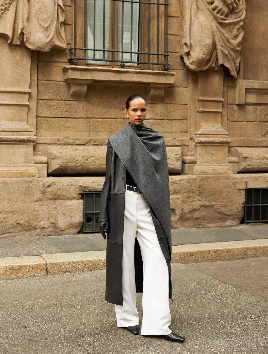According to Vogue, scarf-attached coats are a globally popular trend. This design was pioneered by Toteme in 2021, aligning with the quiet luxury movement. Many styles feature scarves sewn directly into the collar rather than being separate, creating minimalist yet striking designs.