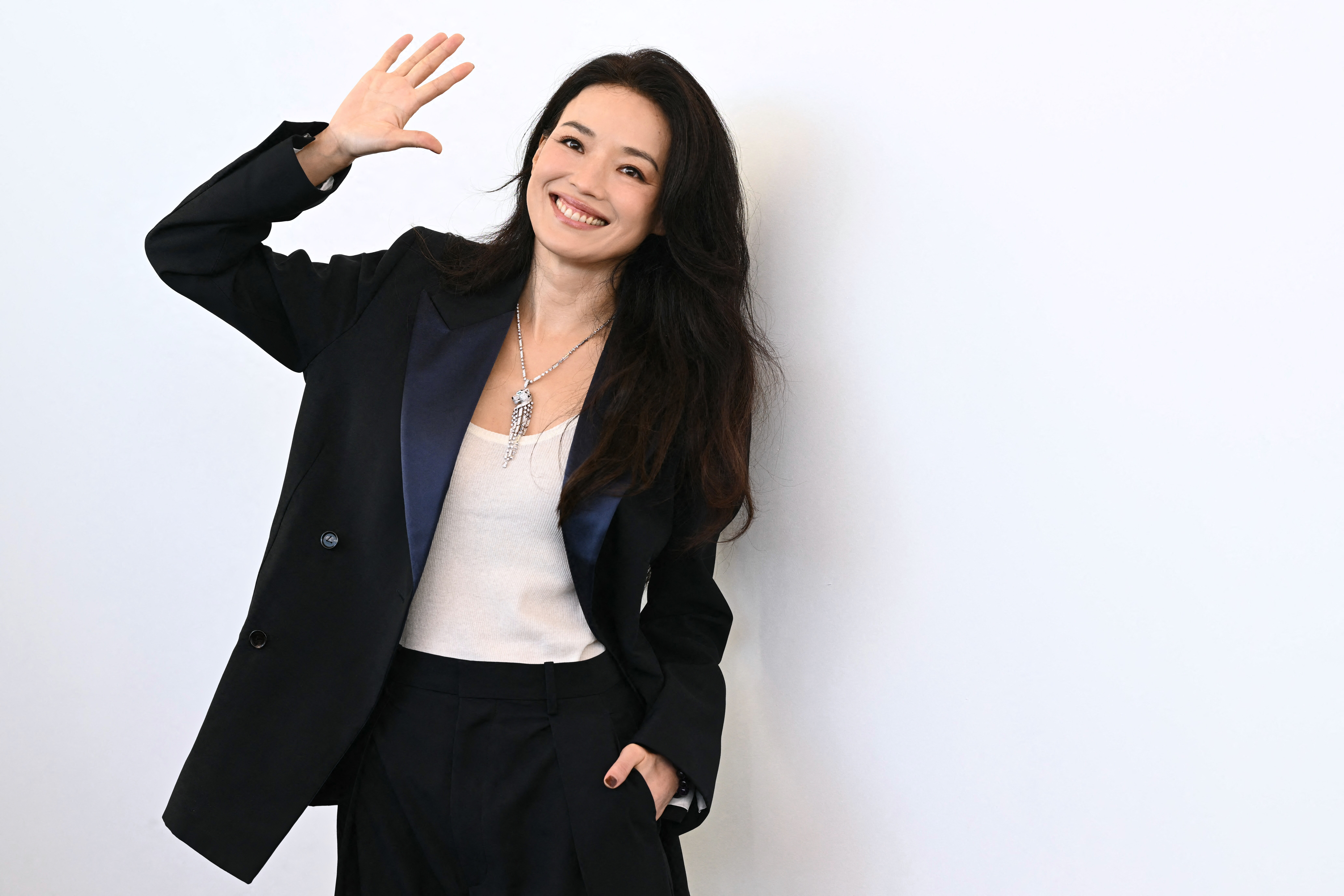 Before the red carpet appearance, the actress attended a press conference for the project. She wore a Bottega Veneta suit, paired with a white T-shirt and a necklace.