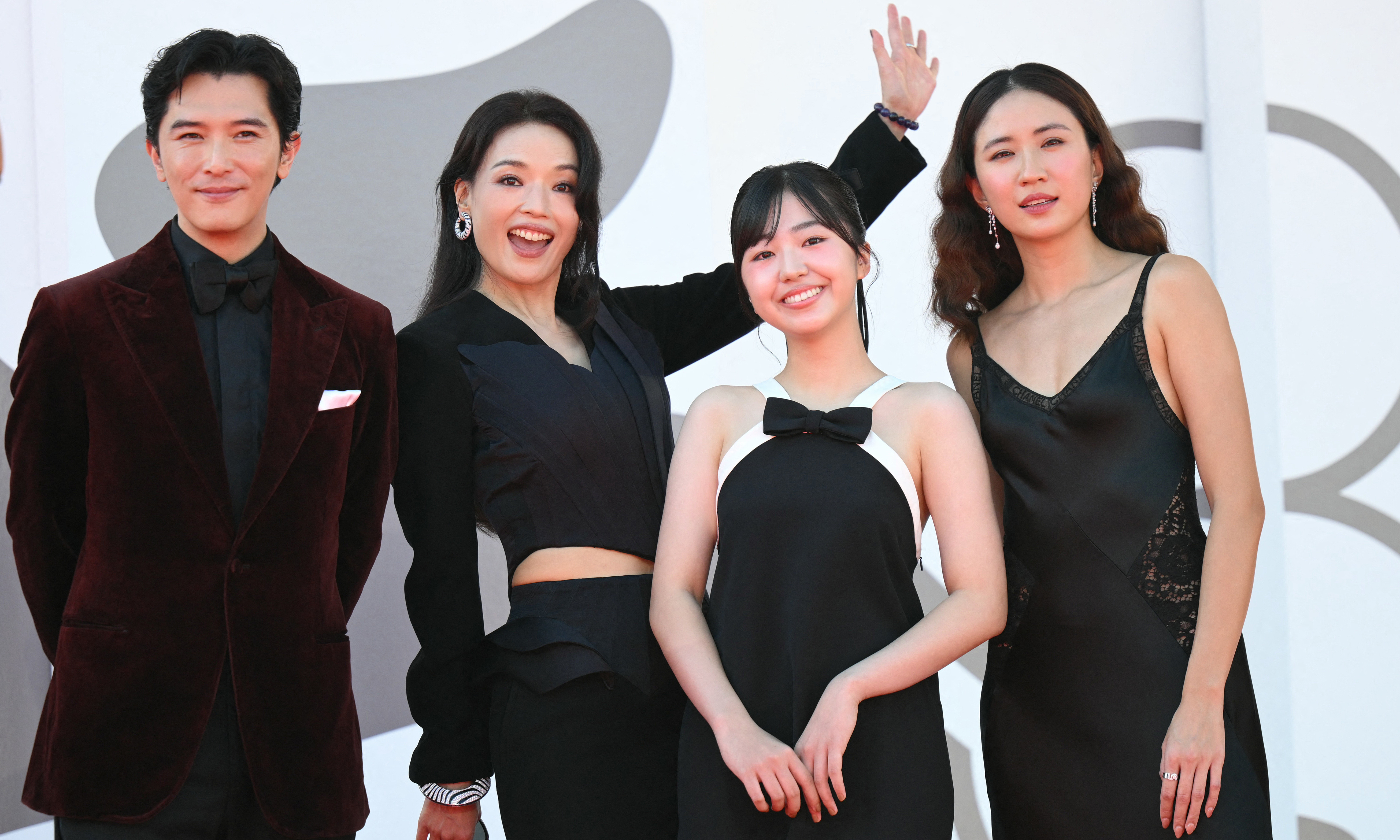 The film's cast, from left to right: Roy Chiu Tse, Shu Qi, Bai Xiaoying, and singer 9m88. The four spent time taking photos and interacting with the media before entering the screening area. |