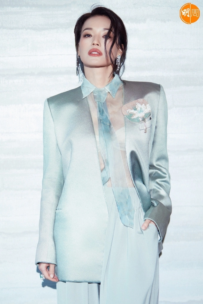 On 16/4, the actress appeared at the event as the head of the jury for new projects. She wore a pastel blue satin suit by Armani Prive, paired with a matching sheer shirt and Cartier fine jewelry. Due to light rain, she carried a transparent umbrella outdoors.
