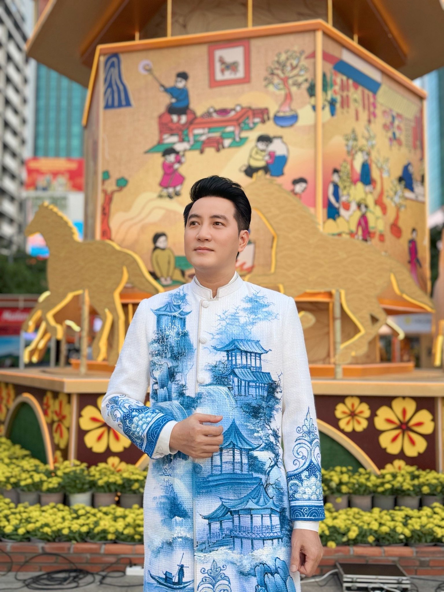 Singer Ngo Kien Huy expressed his impression of the horse mascot at the welcome gate near the People's Committee of TP HCM. The mascot is designed in the image of the mythical Thien Giong (Saint Giong) horse ascending to the sky, with internal motors allowing its head and legs to move.
