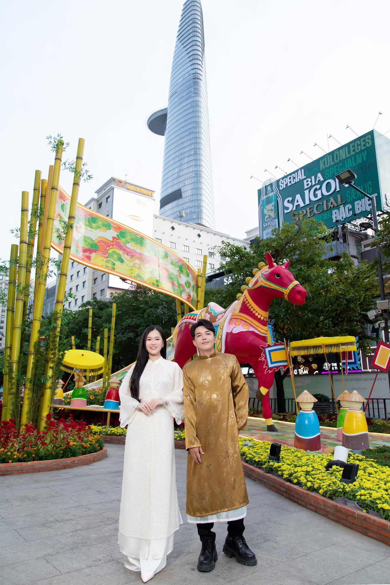 Gin Tuan Kiet and Puka posed for commemorative photos in front of horse models and the 'Radiant Land of Memories' grand display, which features a revolving lantern, recreating a folk scene of Tet.