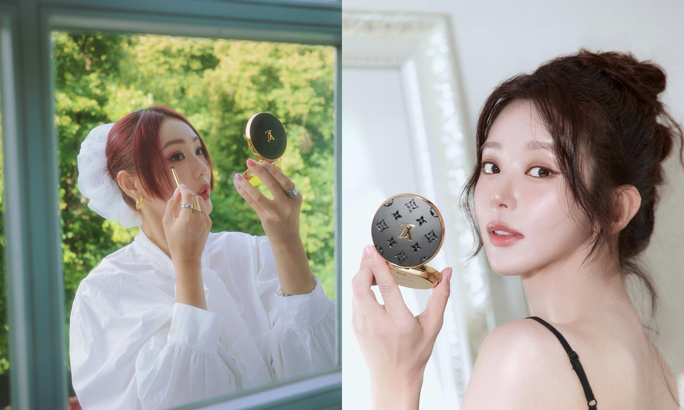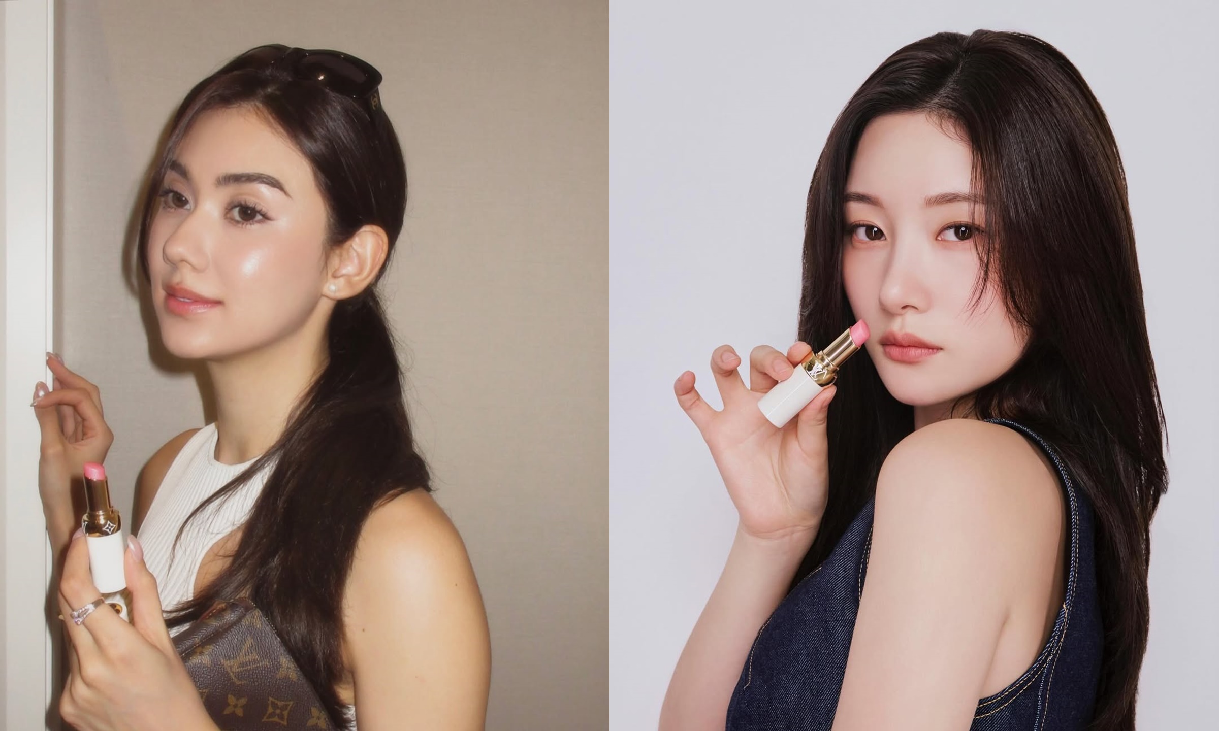 Actresses Lorena Schuett and Jung Chae Yeon (right) are praised for their radiant complexions, achieved with the pale pink 030 Tender Bliss lip balm and neutral shades from the LV Ombres eyeshadow palette.