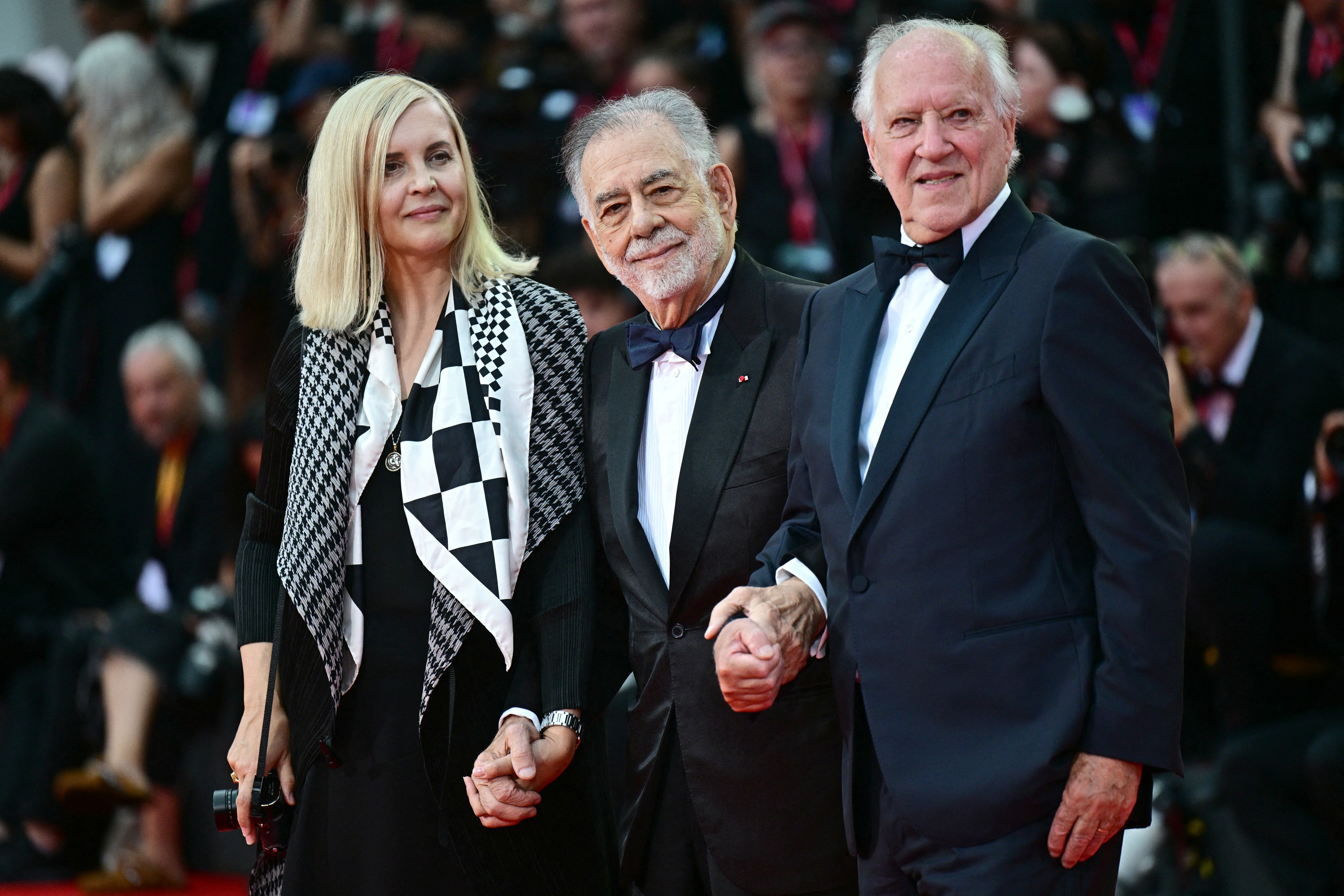 American director Francis Ford Coppola (center) with German director Werner Herzog (right) and visual artist Lena Herzog (left) posed for photos on the red carpet. The ceremony marked Coppola's first public appearance since undergoing heart surgery in early August. The Hollywood Reporter described Coppola as fully enjoying his time on the red carpet, even acknowledging the applause from fans on both sides.
