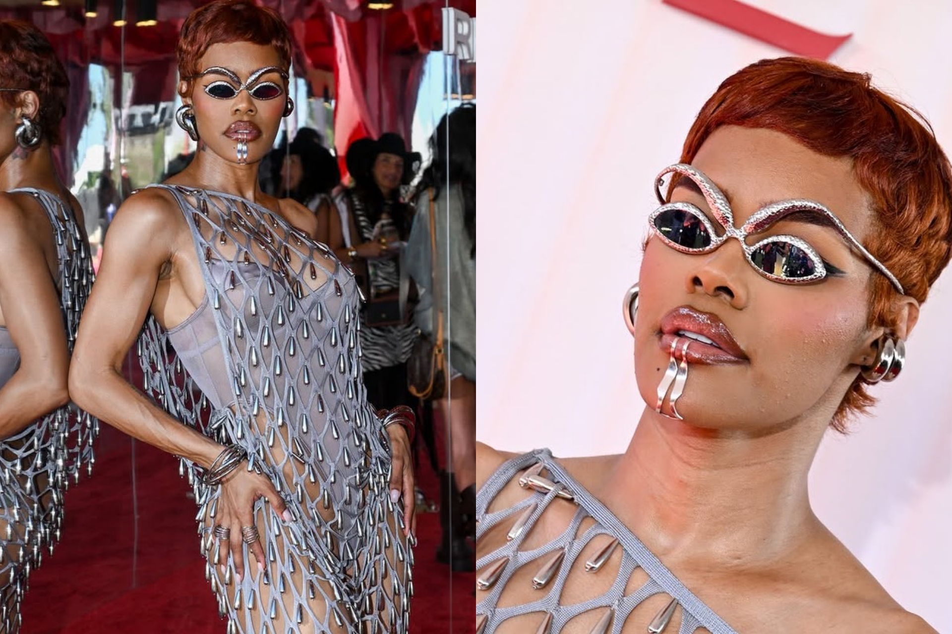 Teyana Taylor showcased a futuristic style with a mesh dress over a sheer bodysuit, complemented by glasses and lip jewelry. *Photo: Instyle.*