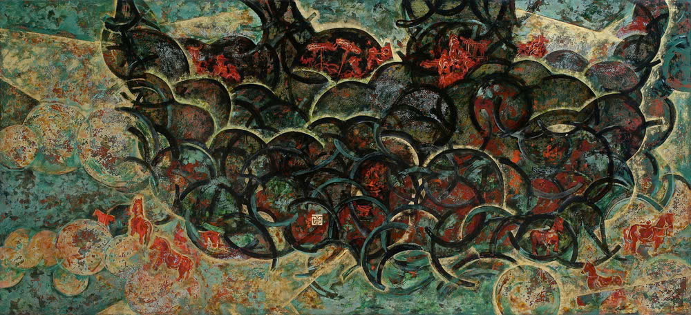 Tra Mi began sketching the painting early in the year and started execution around march-april. In her work, she depicts stone horse statues, civil mandarins, and military mandarins found in Hue's royal tombs, symbolizing the past. From these figures, a large mass of trees emerges, with intertwined and overlapping branches, creating the impression that old images are gradually dissolving into space, leaving behind the solitary statues. Through this piece, Tra Mi conveys her thoughts on the existence and current value of old artifacts, expressing her appreciation for the past.