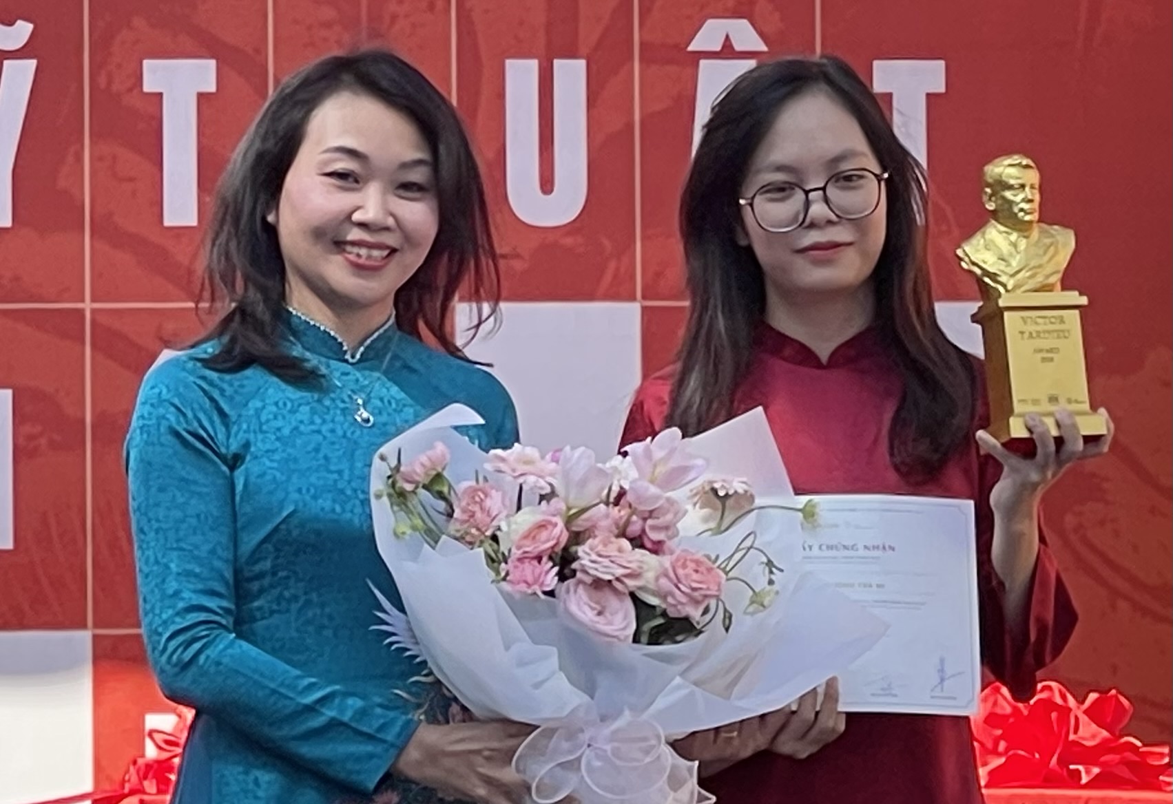 Dang Thi Phong Lan, rector of the Vietnam University of Fine Arts (left), presents a certificate and trophy to Nguyen Duong Tra Mi. Photo: Phuong Linh