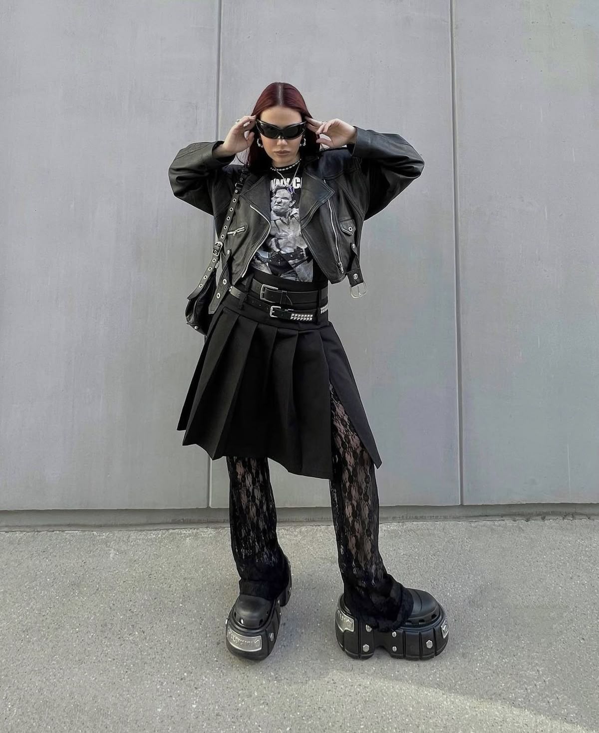 Oversized Crocs can be paired with gothic, punk styles, or the skirt-over-pants trend from the 1990s. |