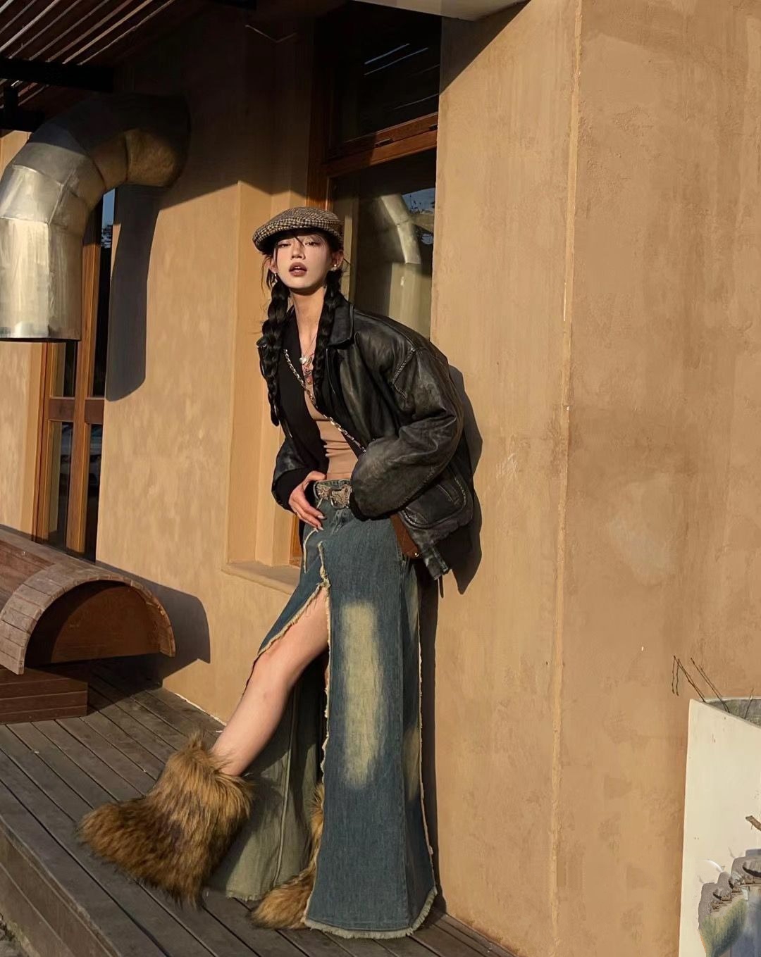 Oversized furry shoes are inherently striking, so simply wear plain attire such as a t-shirt, jeans, a plain turtleneck sweater, paired with a split denim skirt or leggings. |