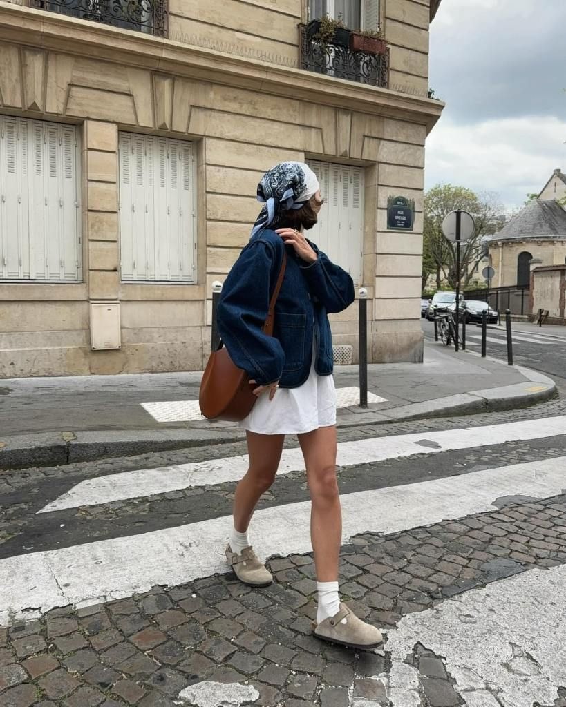 For suede Birkenstock clogs, add white socks, paired with a mini skirt, a denim jacket, or jeans and a Harrington jacket. |