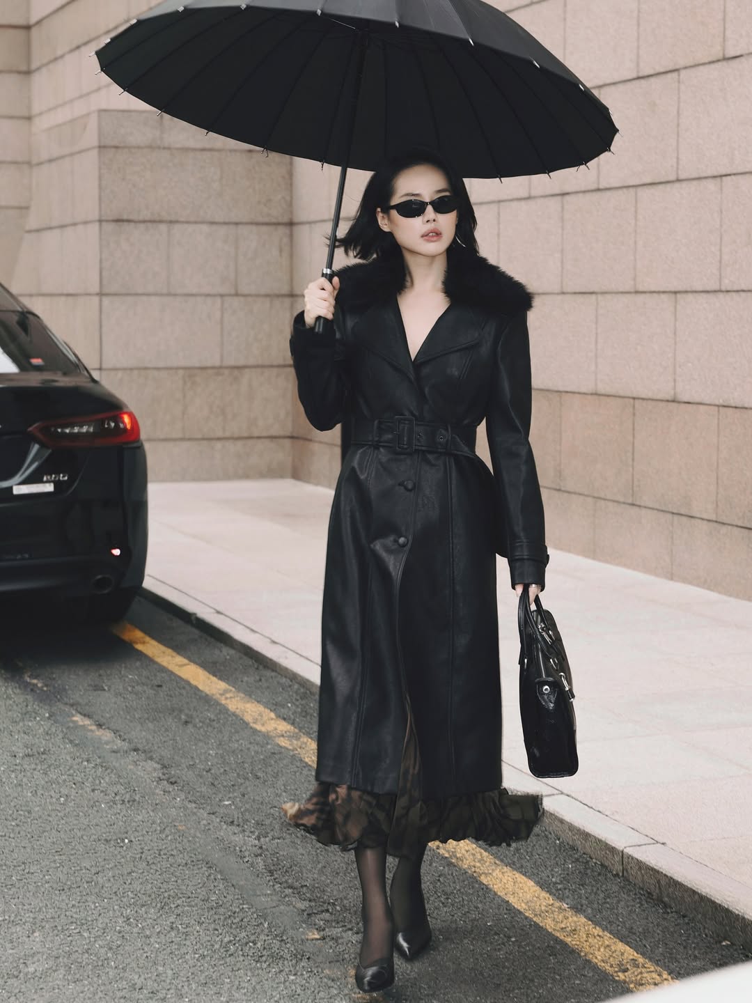 Model Khanh Linh also chose this design in a leather version, pairing it with a midi skirt for a powerful, lady-like style.