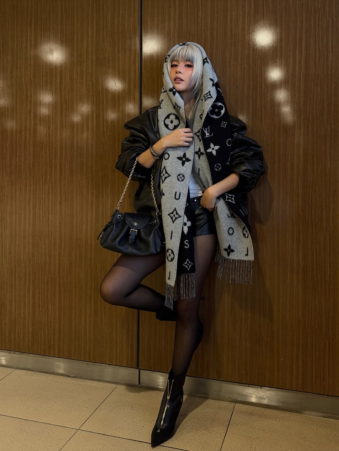 Similarly, fashionista Quynh Anh Shyn chose a black leather design, coordinating it with shorts and a vintage-style handbag. She accented her dark outfit with a gray Louis Vuitton scarf.