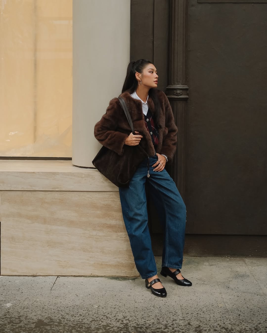 Runner-up Thao Nhi Le walked the streets in jeans, a faux fur coat, a classic argyle cardigan, and Mary Jane shoes, creating a sophisticated ensemble.