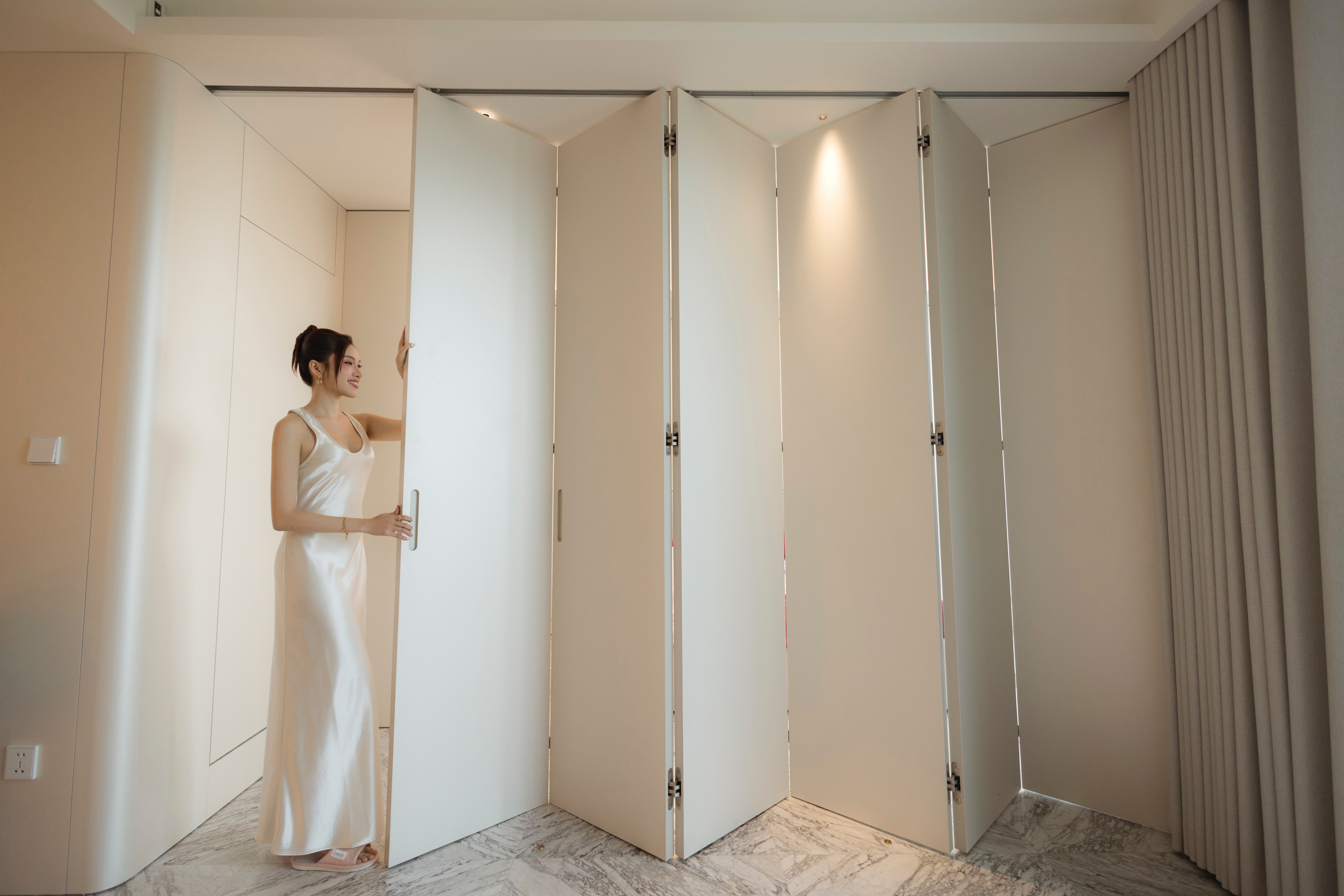 She uses several mother-of-pearl cabinets with a slight sheen, combined with curtains.