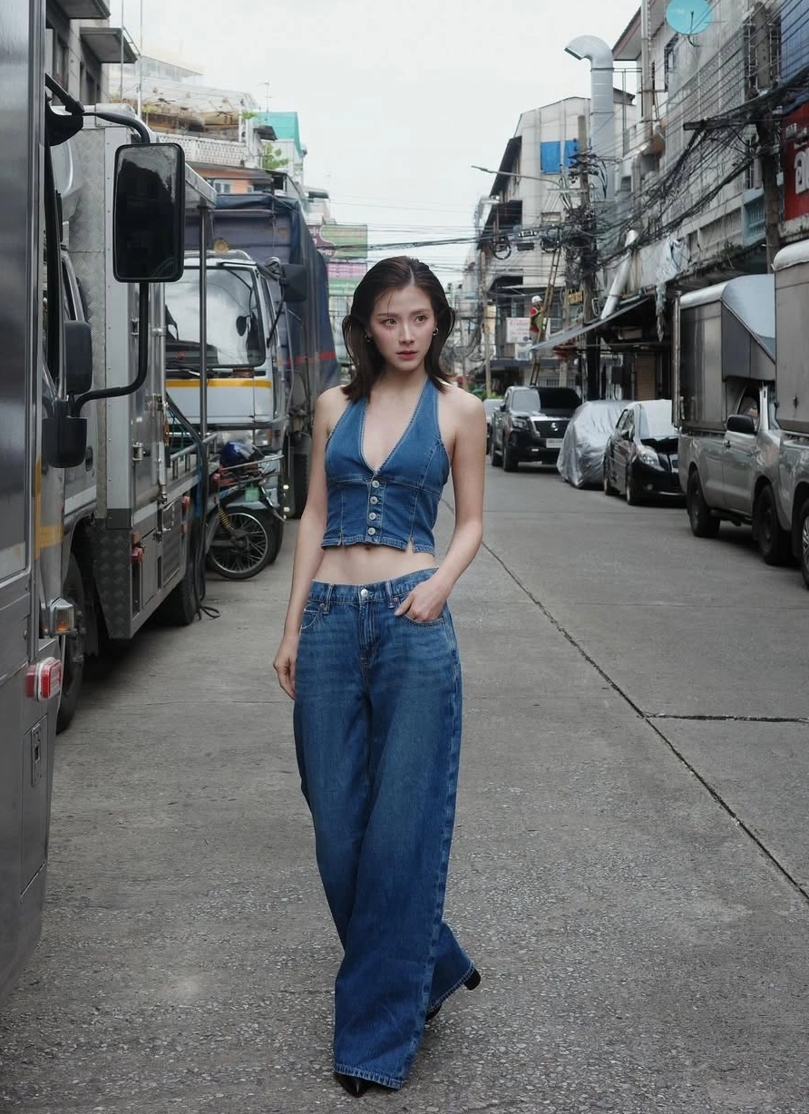 Baifern's street style features a full denim ensemble, including a midriff-baring denim crop top and wide-leg pants. |