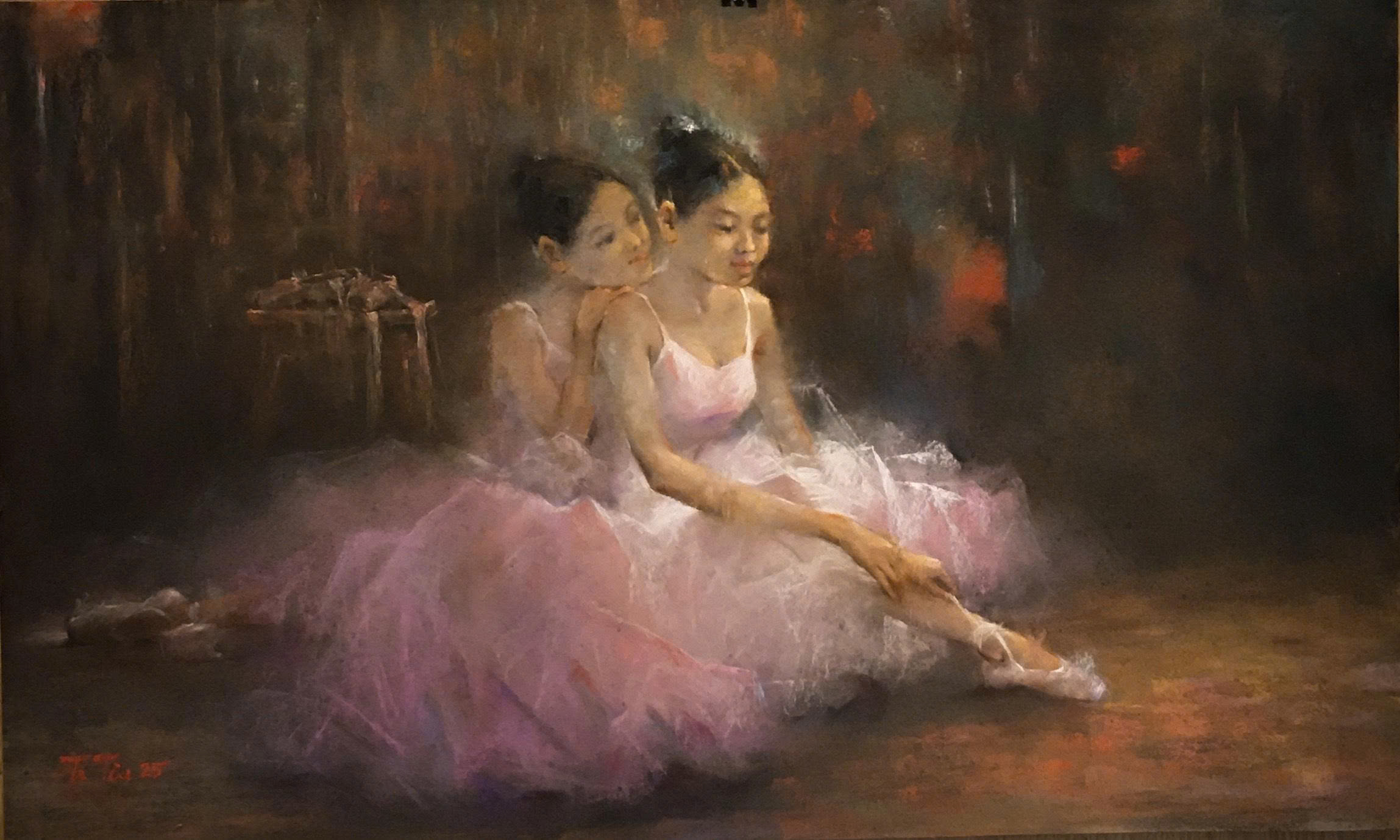 Even though the dancers' costumes are simple, featuring white, blue, or pink tones, Nguyen Trong Tai creates depth and movement through subtle brushstrokes, combining light and dark layers to make the tulle appear soft and fluid. |