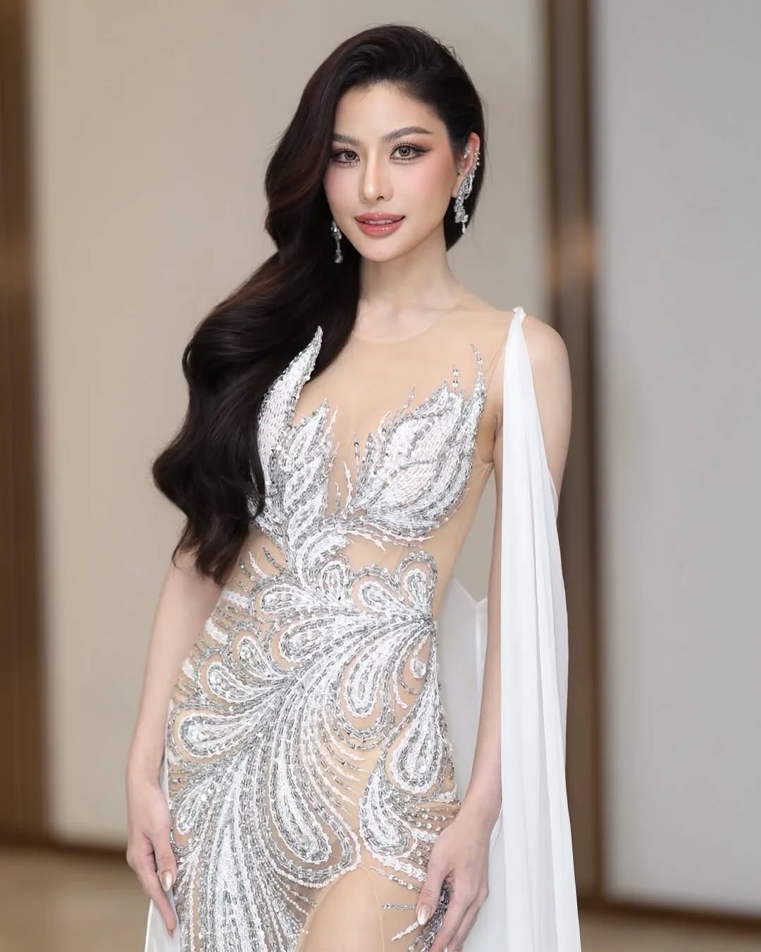 The beauty accentuated her figure in a sheer gown during the evening wear segment. |