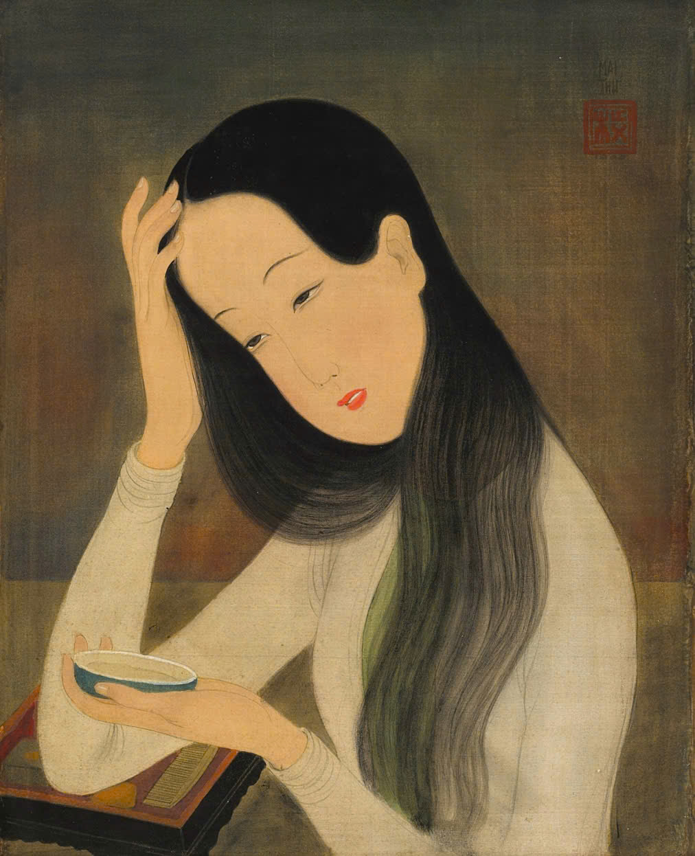 Mai Trung Thu began painting young women using oil paint, his major at art school, before transitioning to silk. After graduating in 1930, he taught at Quoc Hoc Hue school, where his talent flourished with a series of silk paintings of women.