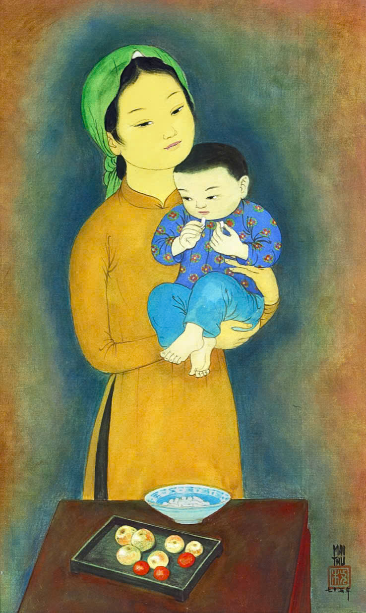 His works continue to command high prices. In the evening of 30/3, at Sotheby's Modern Day Auction, "Gourmandise", a work honoring motherhood with an image of a mother holding her child, sold for 2,4 million HKD (approximately 8,1 billion VND). This figure surpassed its estimated value of 800,000 to 1,8 million HKD. The artist's signature, seal, and the year of creation are visible in the lower right corner of the painting.