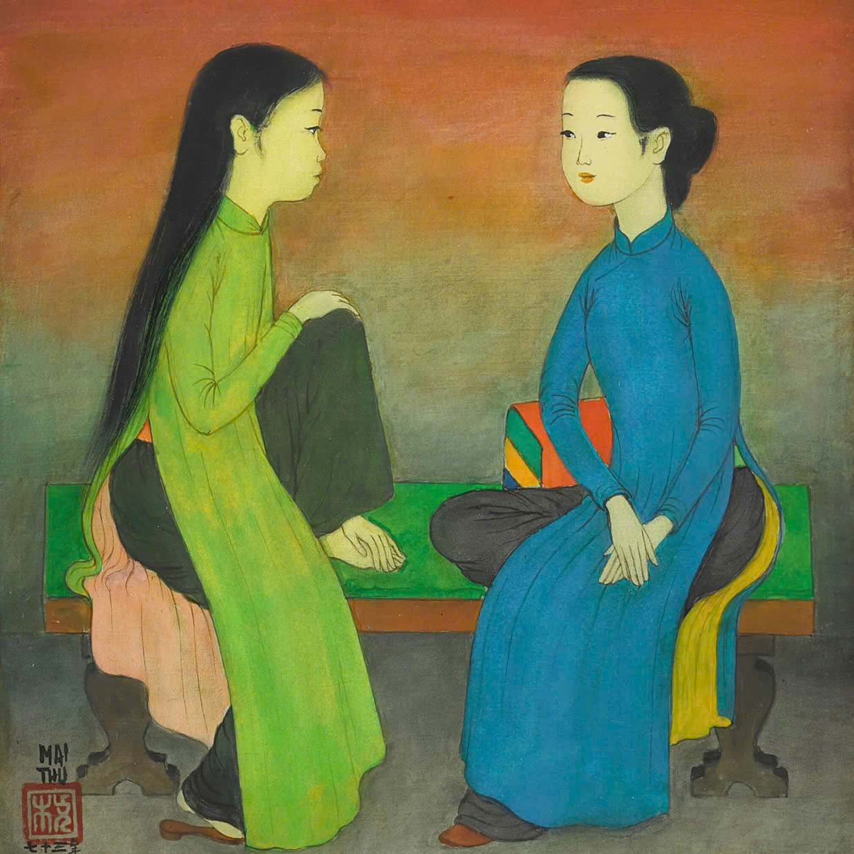 In "Conversation", the artist depicted two young women seated and chatting. This piece achieved 896,000 HKD (three billion VND) at Sotheby's auction.
