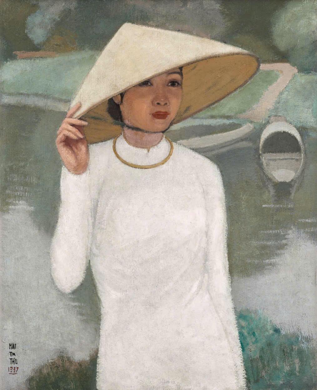 According to Sotheby's, the subject in this work is believed to have inspired Mai Trung Thu. The young woman, dressed in a white ao dai and conical hat, complemented by a bronze-colored necklace, embodies the quintessential beauty of Hue women of that era. Her right hand gently lifts the conical hat, highlighting her feminine grace.