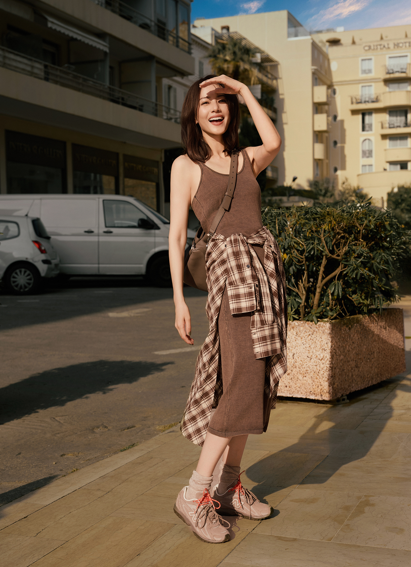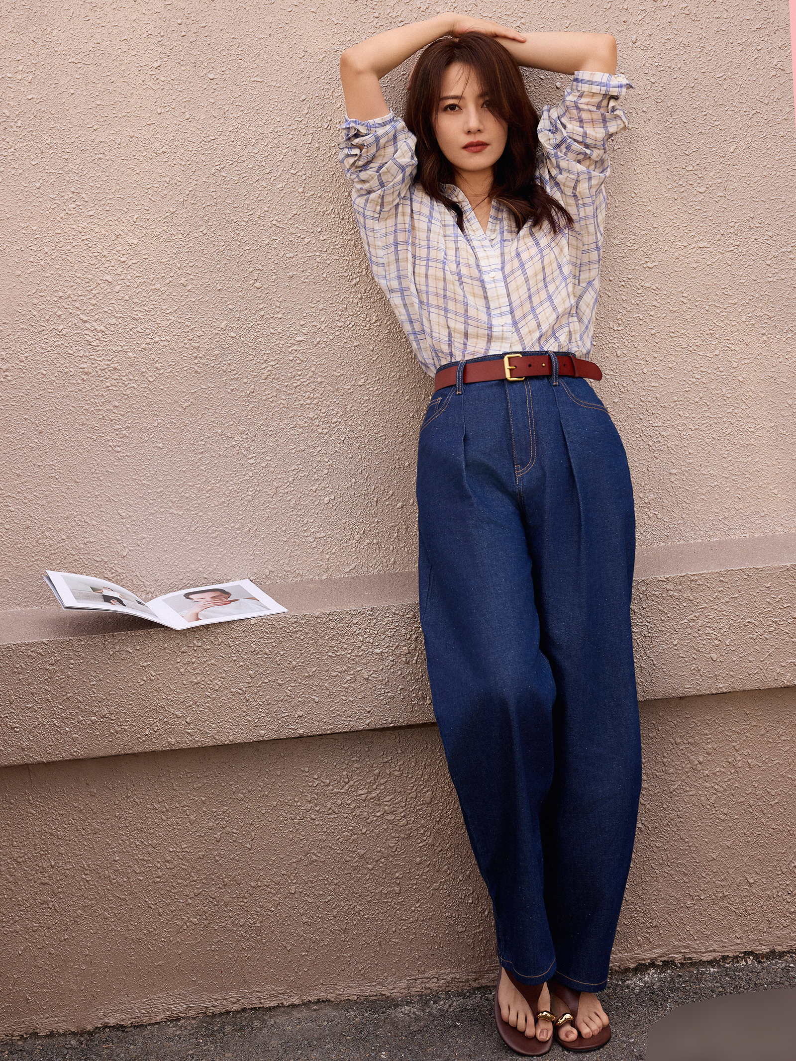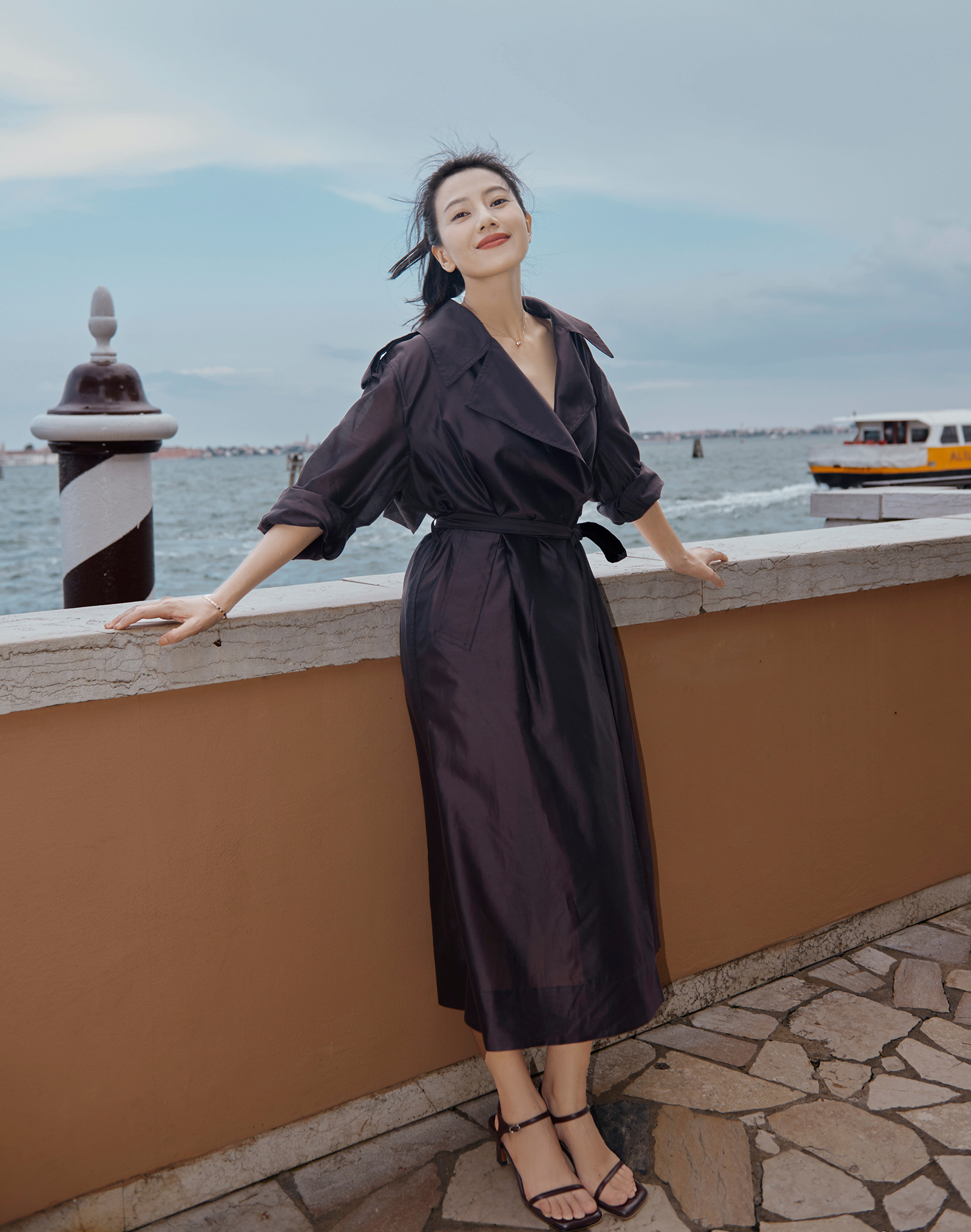 The beauty walked the streets in late autumn, wearing a classic windbreaker paired with sandals that matched her outfit color. |
