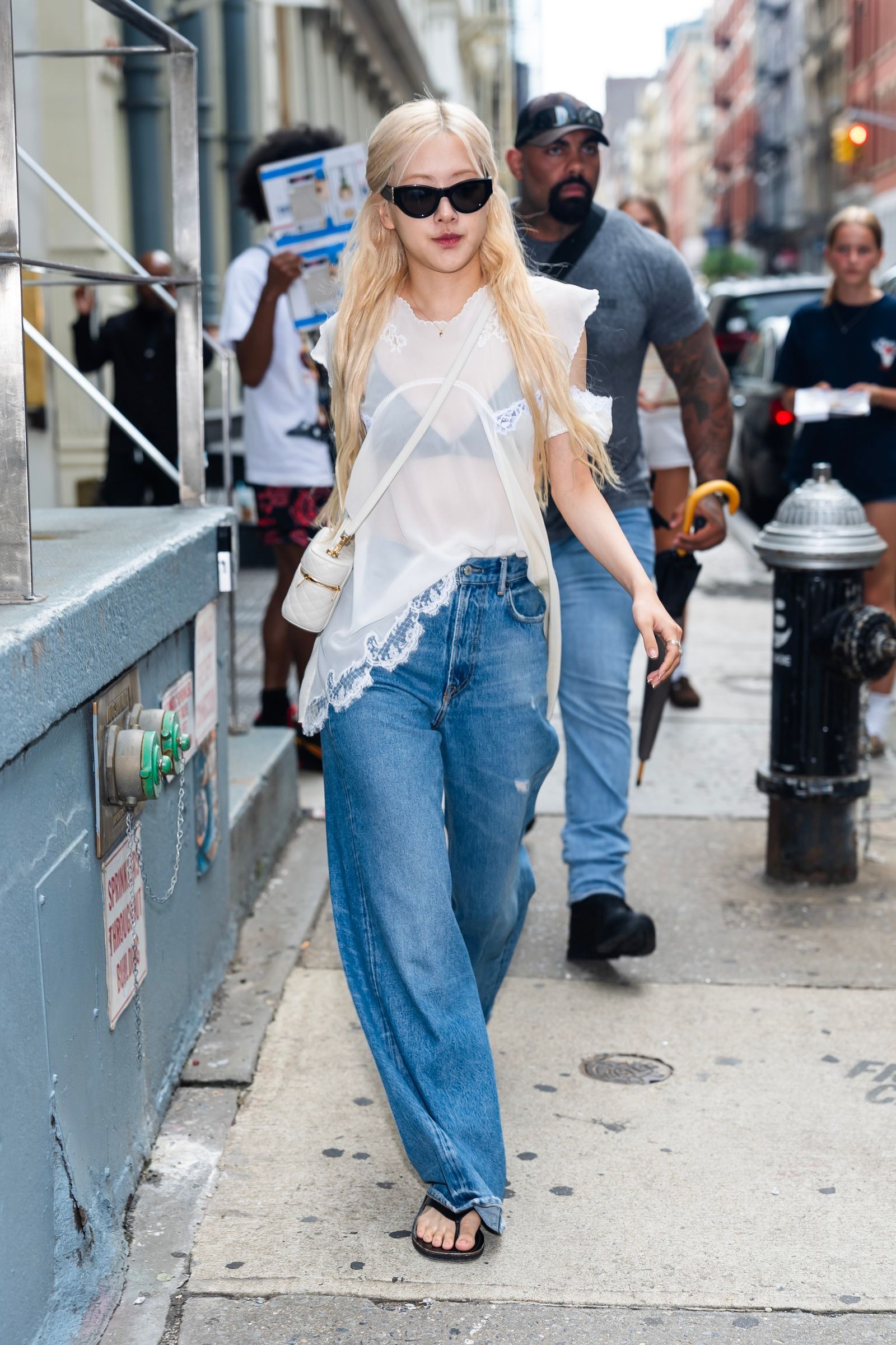 The Blackpink member promotes the trend of sheer tops paired with visible lingerie.