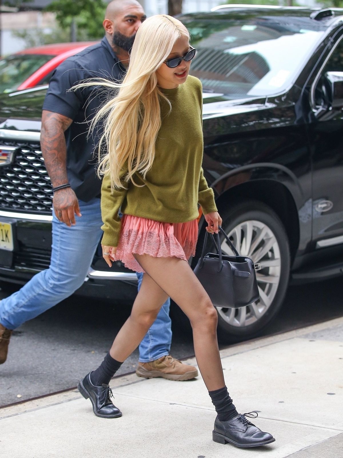 The singer pairs a slip dress with a thin sweater, oxford shoes, and a The Row bag. Rose is a known enthusiast of this fashion house, boasting a collection of their bags in various sizes, including: Bindle, Domino, Margaux, N/S Park, and Portfolio, each valued at several thousand USD.