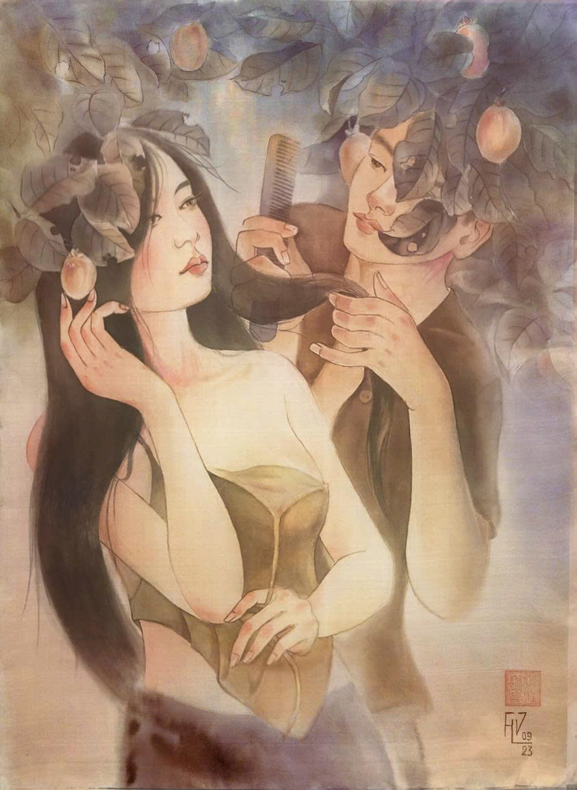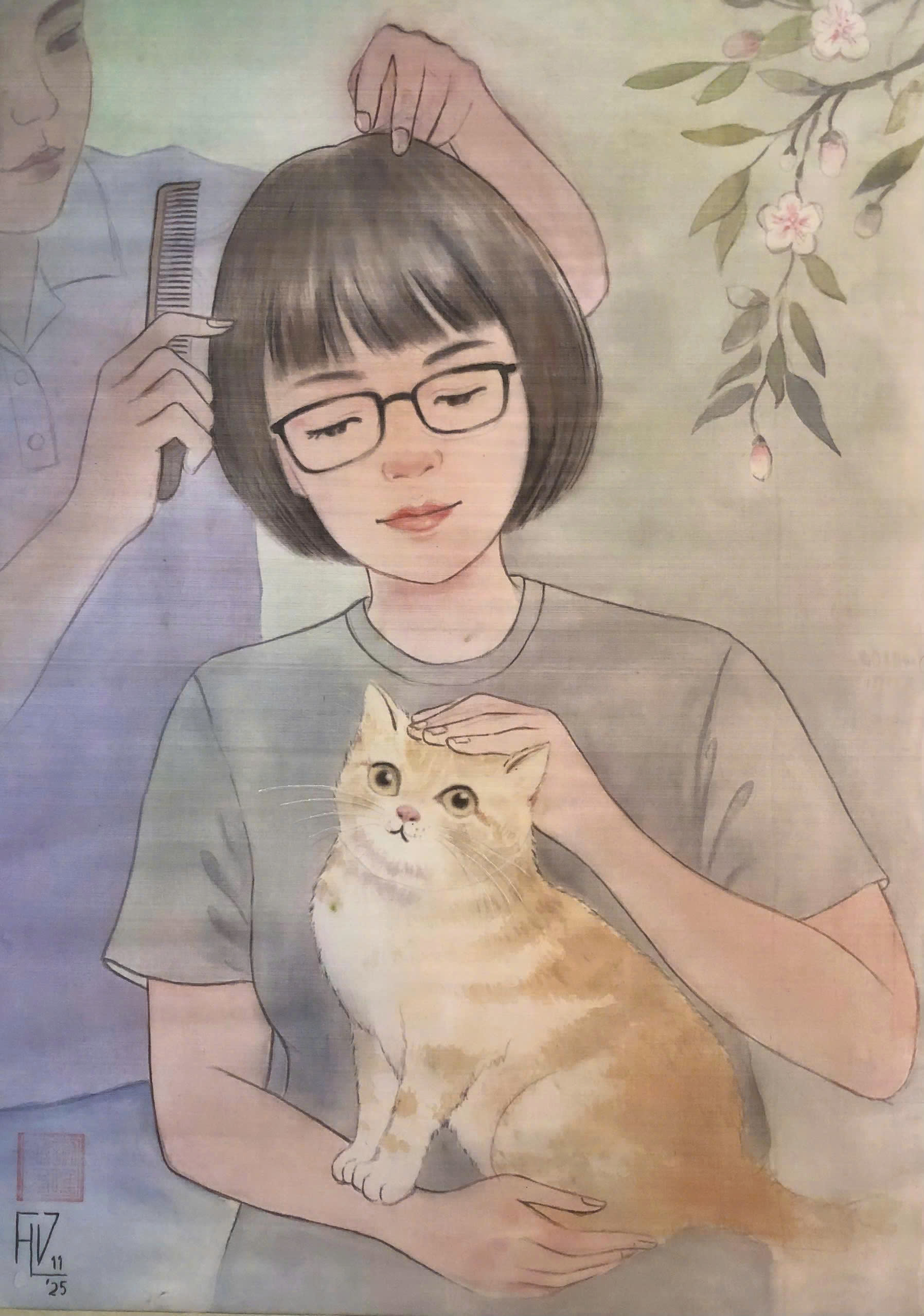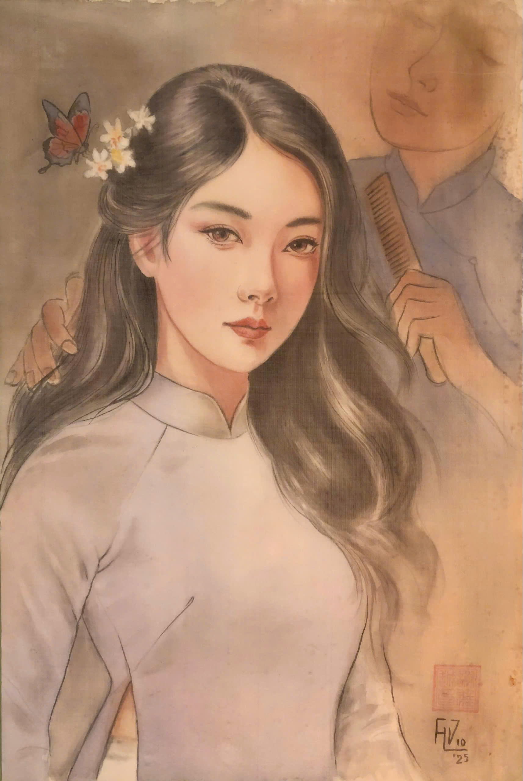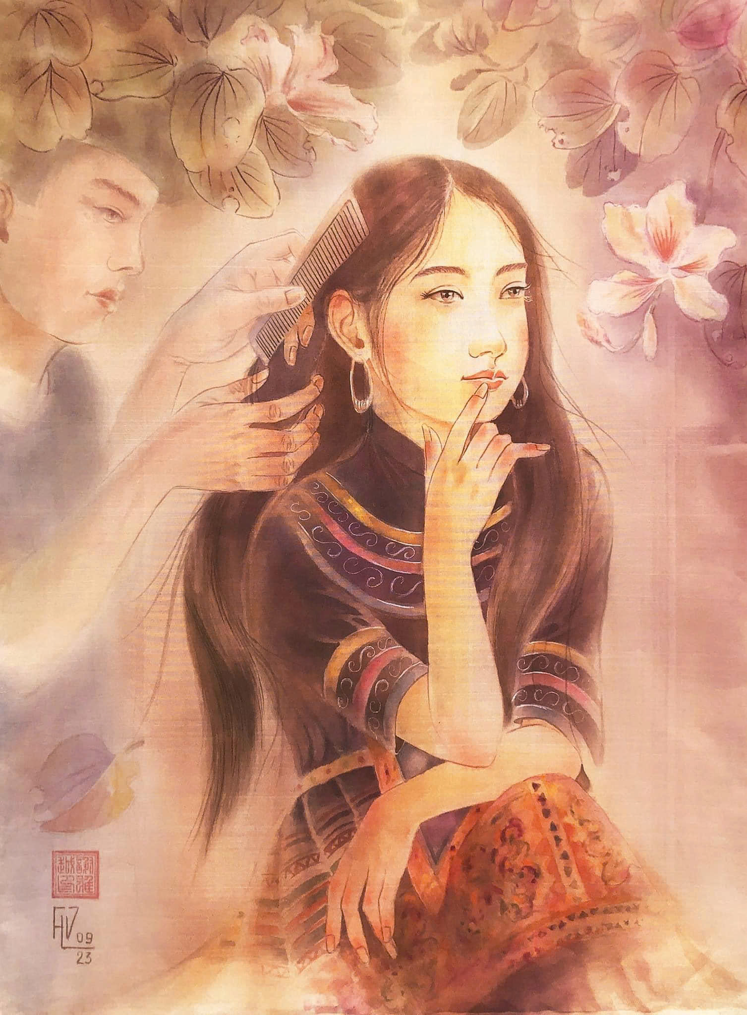 A recurring motif in Viet's art is the comb, which he chose as a symbol of connection. According to the artist, the comb represents a keepsake that links family affection and romantic love, carrying the warmth of hands, the scent of hair, and stories of gratitude and fidelity preserved through generations. He frequently depicts intimate moments like a grandmother combing her grandchild's hair or a mother tending to her child's, thereby honoring the value of kinship.