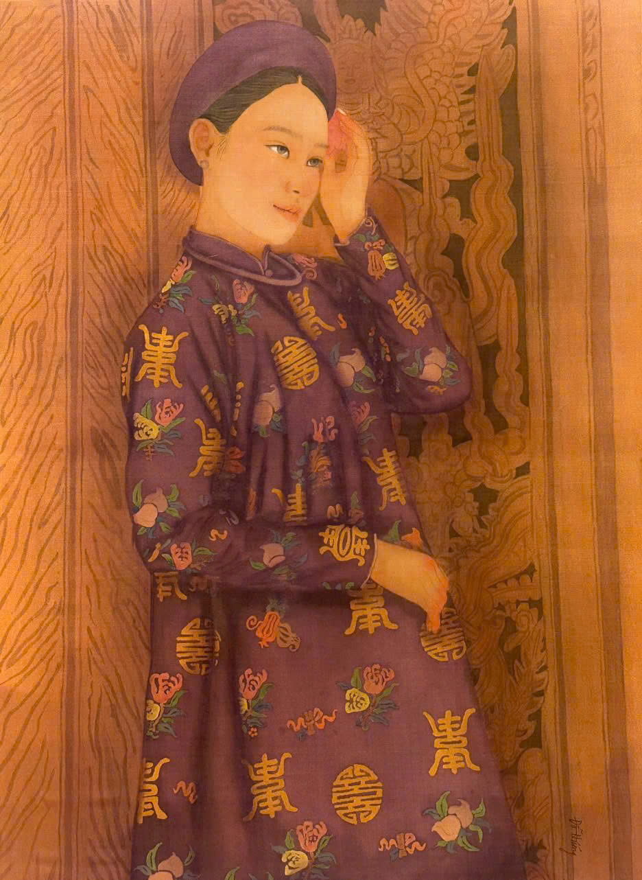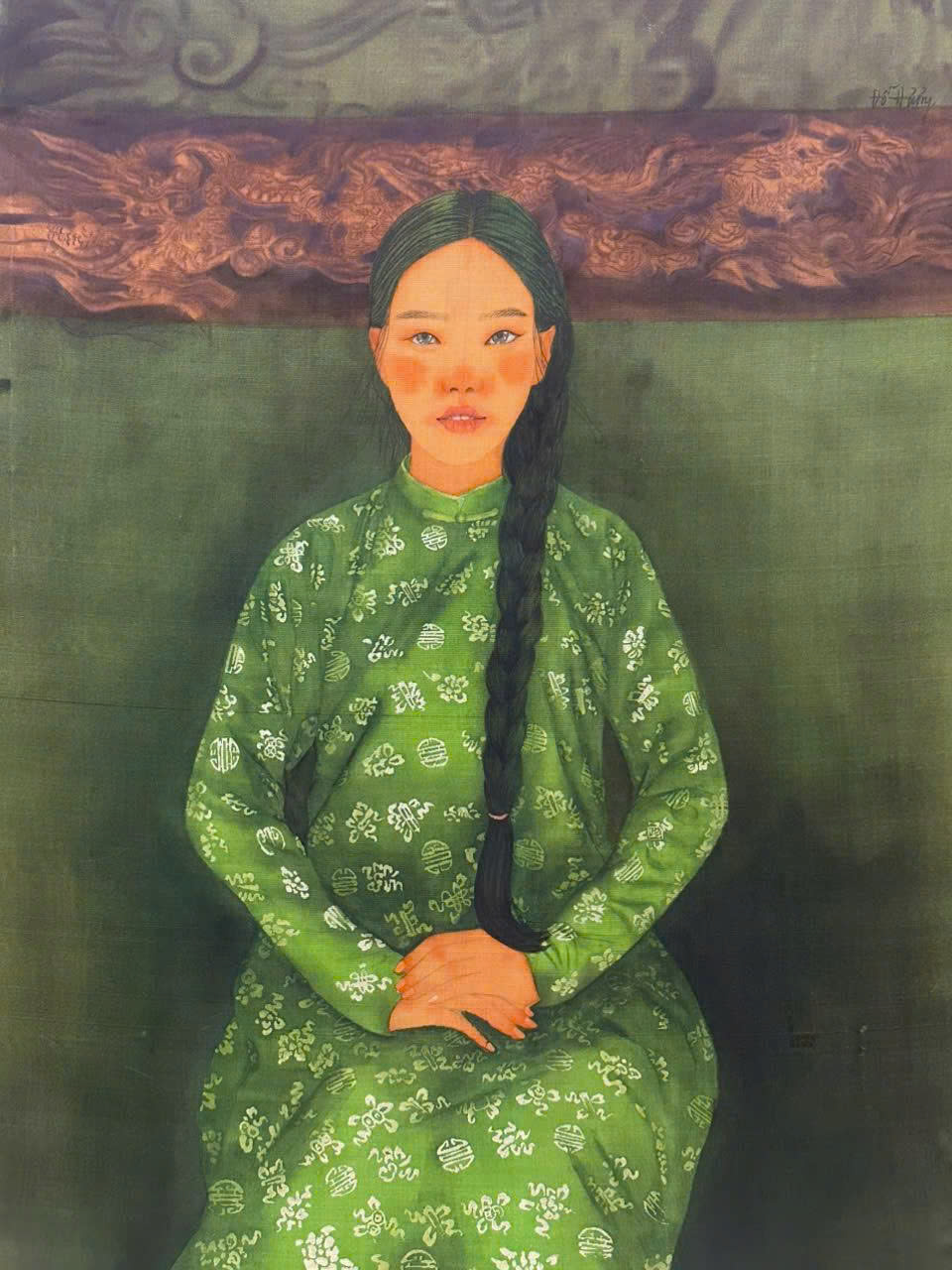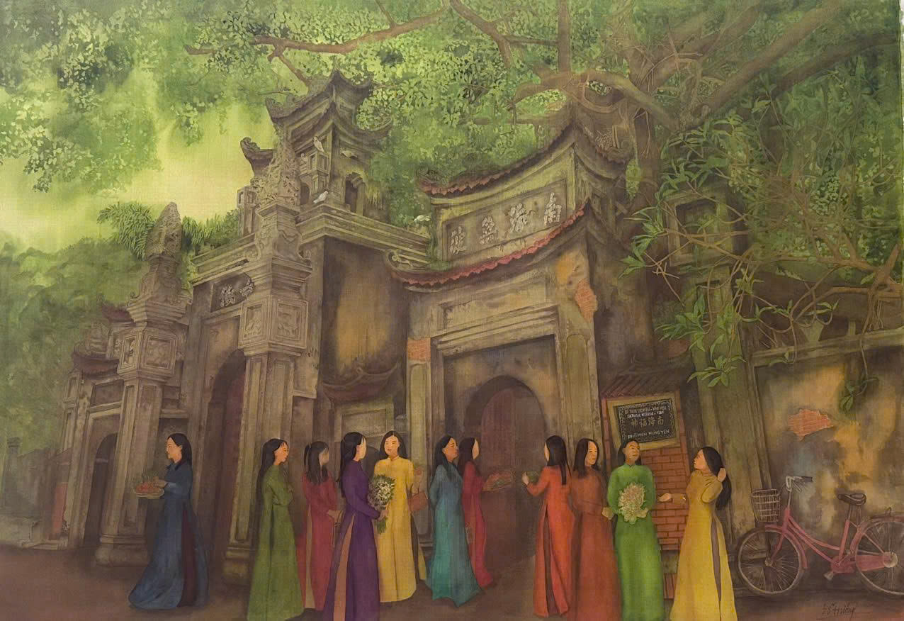 Huong's compositions often create a dialogue between the foreground and background. Her female figures are centrally positioned in the foreground, while a dark palette in the background subtly suggests the past. For example, one painting features a young woman in an ao ngu than (five-panel dress) with a Ly - Tran era door behind her, illustrating "the subtle presence of cultural weight".