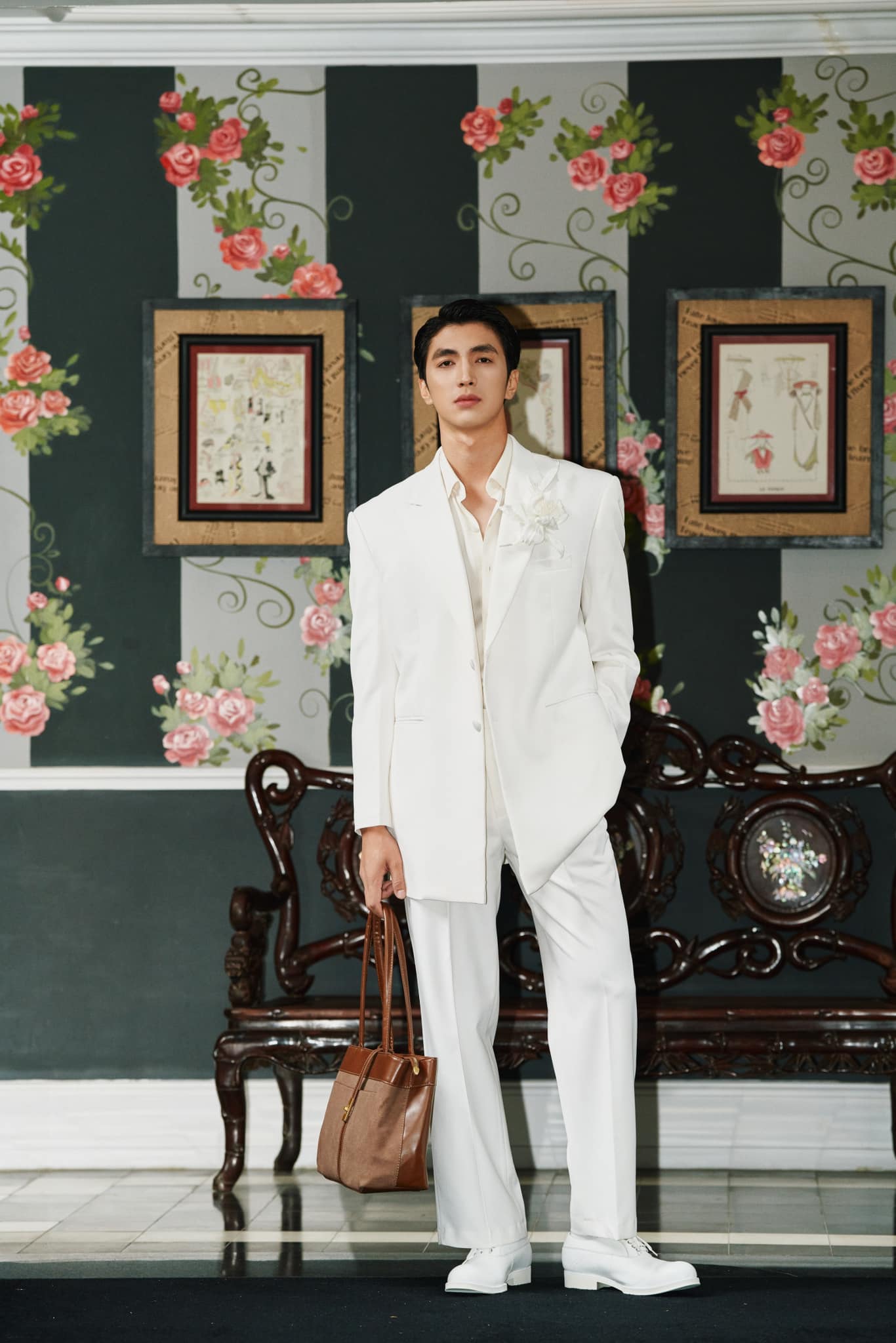 The actor adds a focal point to his "white on white" outfit with a large brown handbag. |