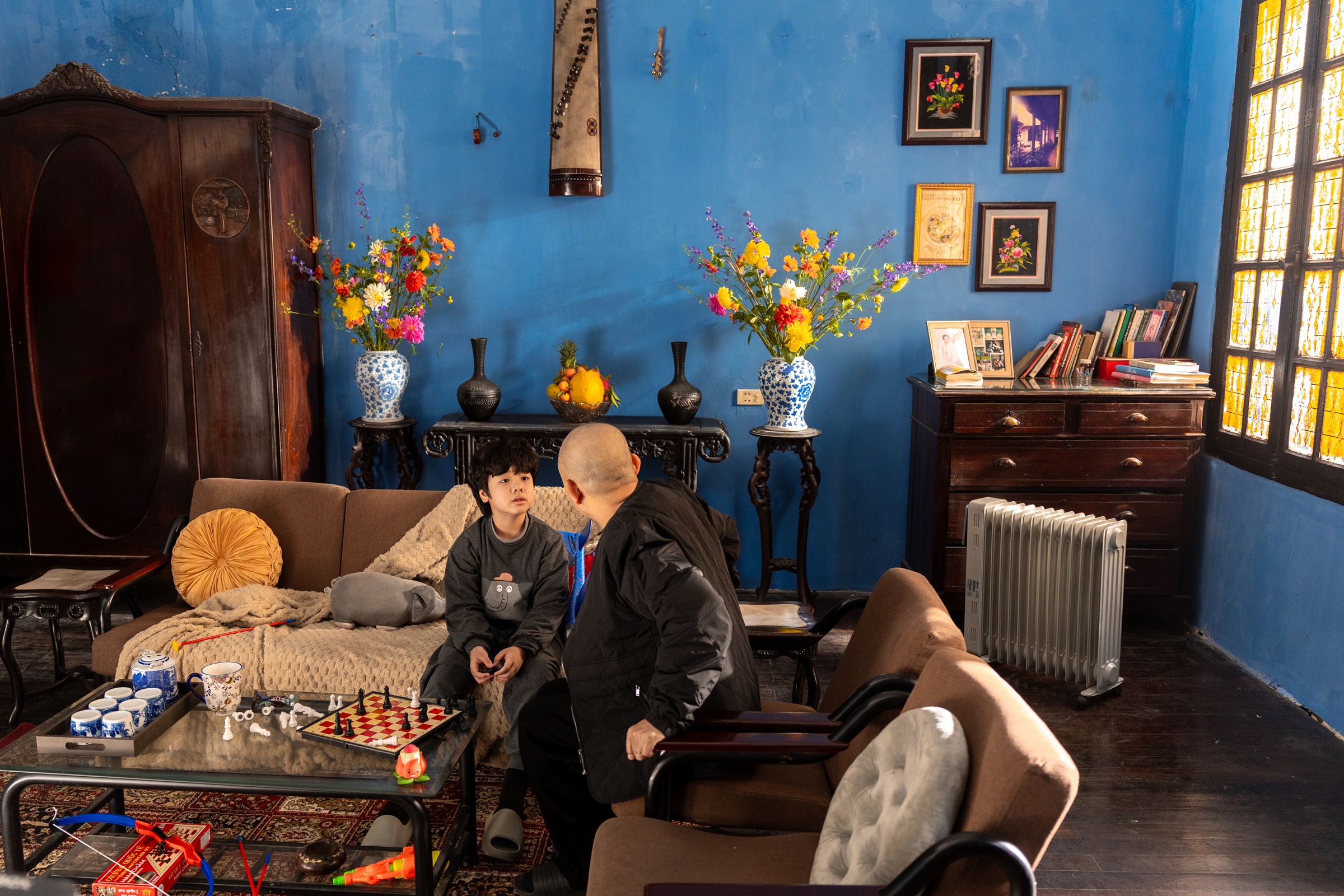 Culture is a pervasive element throughout "The Scent of Pho." The film is steeped in Northern Vietnamese flavor, with evocative settings in Hanoi and Nam Dinh, featuring two rival pho stalls, Mui and Dan. Scenes of an old house in Hang Be, bustling streets, vendor calls, and lively conversations vividly recreate the ambiance of a bygone era. The production team meticulously integrated traditional art, from Hang Trong folk paintings depicting a vibrant Mid-Autumn Festival in the main character's bedroom to graphics inspired by Dong Ho paintings for a Chau van performance, highlighting daily life with bright colors. Details like baked brick courtyards and blue glazed vases with Bat Trang patterns further enrich the Vietnamese spirit.