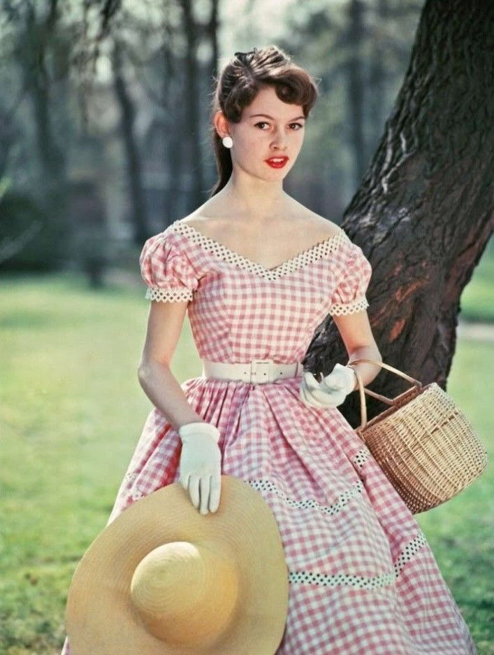 Bardot's style also included gingham dresses, embodying a country aesthetic. In the 1950s, upon marrying actor Jacques Charrier, she wore a pink and white gingham dress, a pattern she continued to embrace for many years. This print evokes the rustic charm of rugs and tablecloths often used by farmers for dining or picnics in gardens and fields. Photo: Pinterest