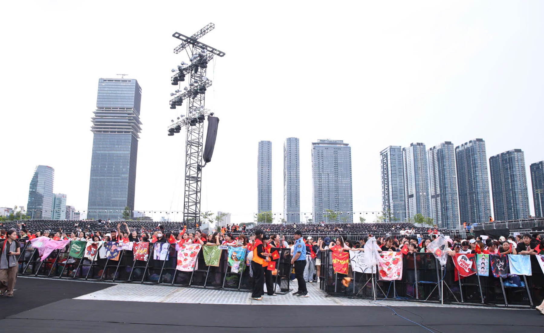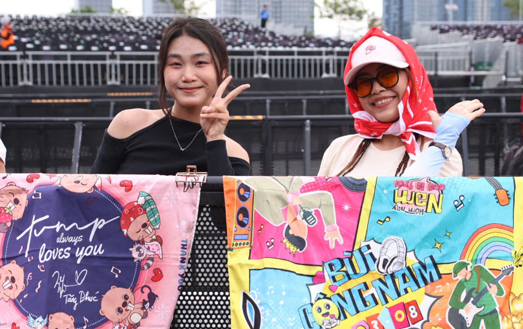 Many young fans displayed silk scarves featuring images of their favorite singers and artists, hanging them on the barriers around the stands.