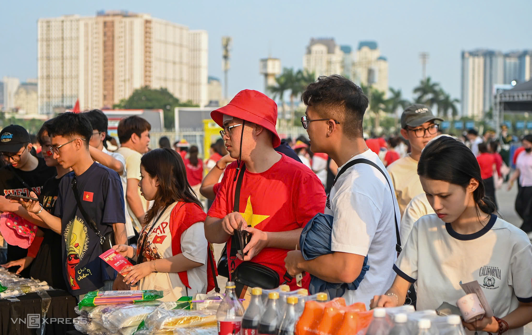 A group of young friends mentioned they met through an online group and planned to "hunt" for tickets together. They carried the red flag with a yellow star, eager to immerse themselves in the concert atmosphere. |