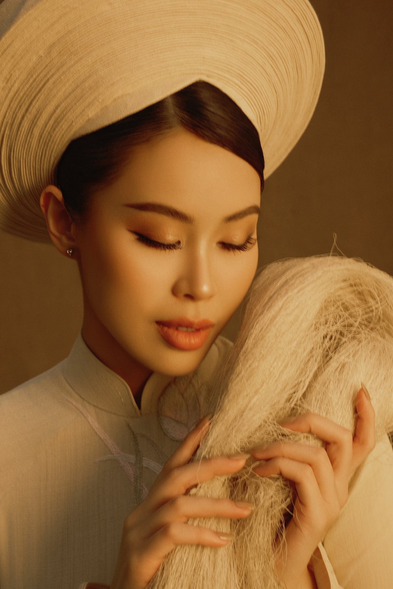 Tien Nguyen posed in a traditional ao dai featuring a high collar, long sleeves, and a straight silhouette. |