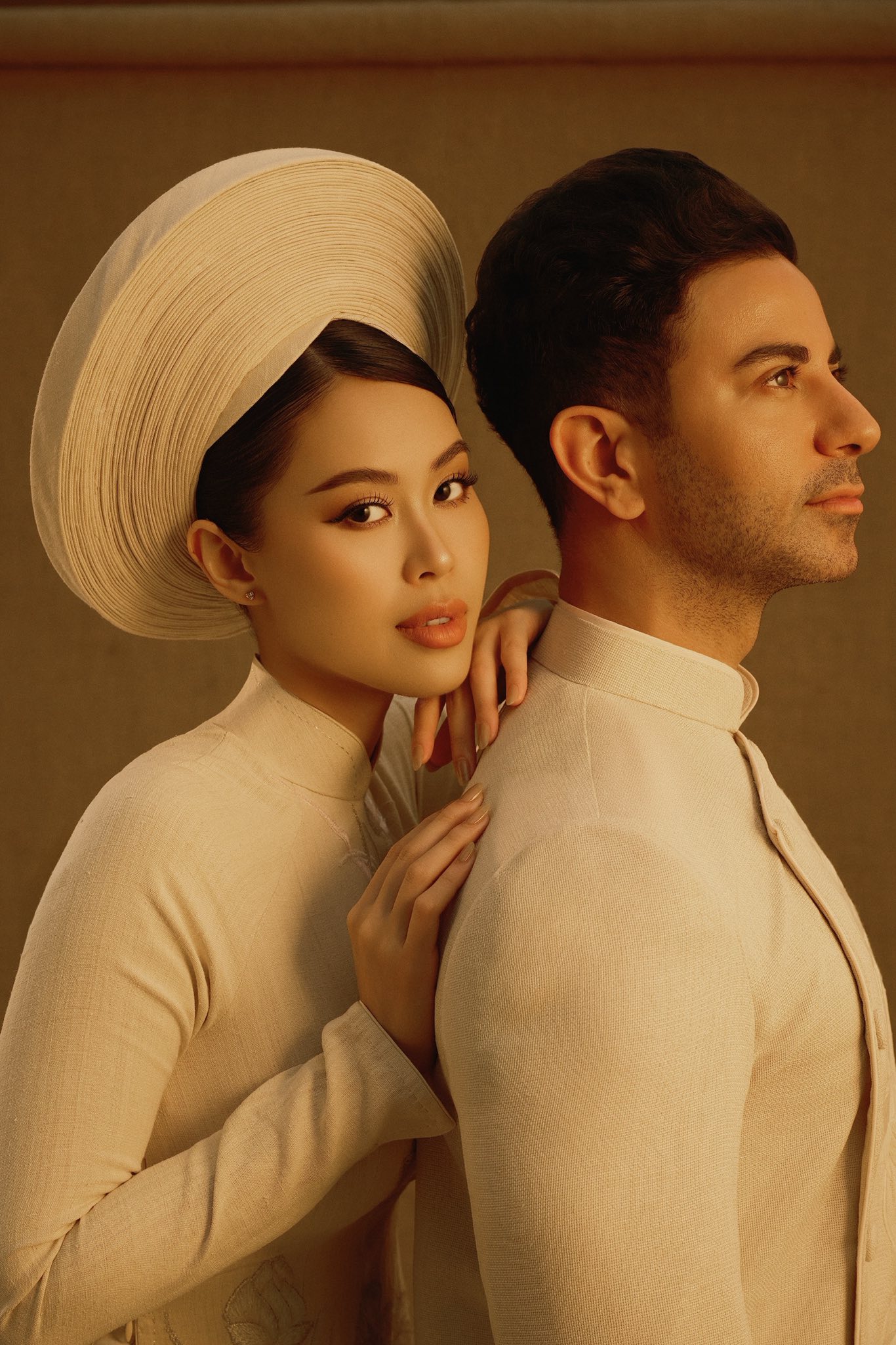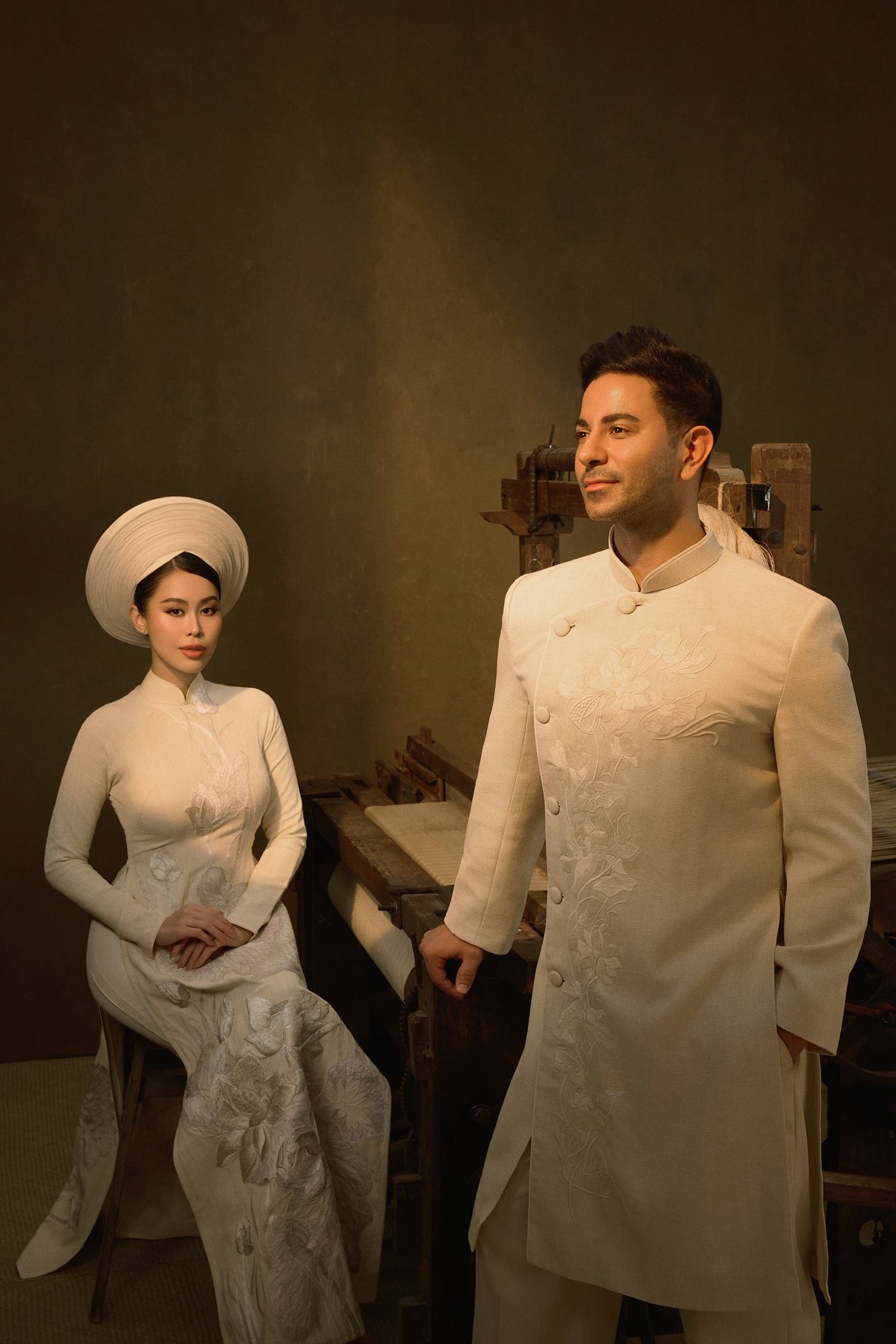 Following their wedding on the evening of 7/12 in Ho Chi Minh City, the team released the couple's pre-wedding photo series. Both wore matching ao dai woven from natural silk, the same attire seen at their ancestral ceremony.