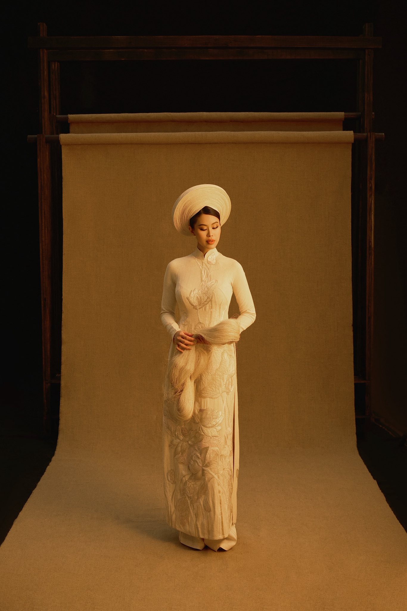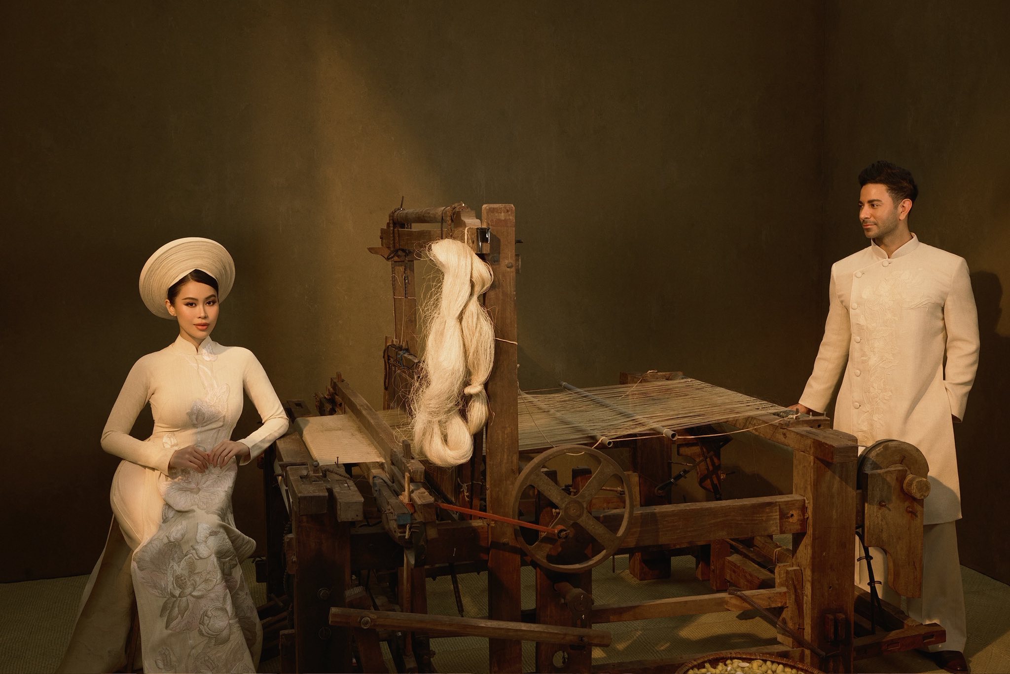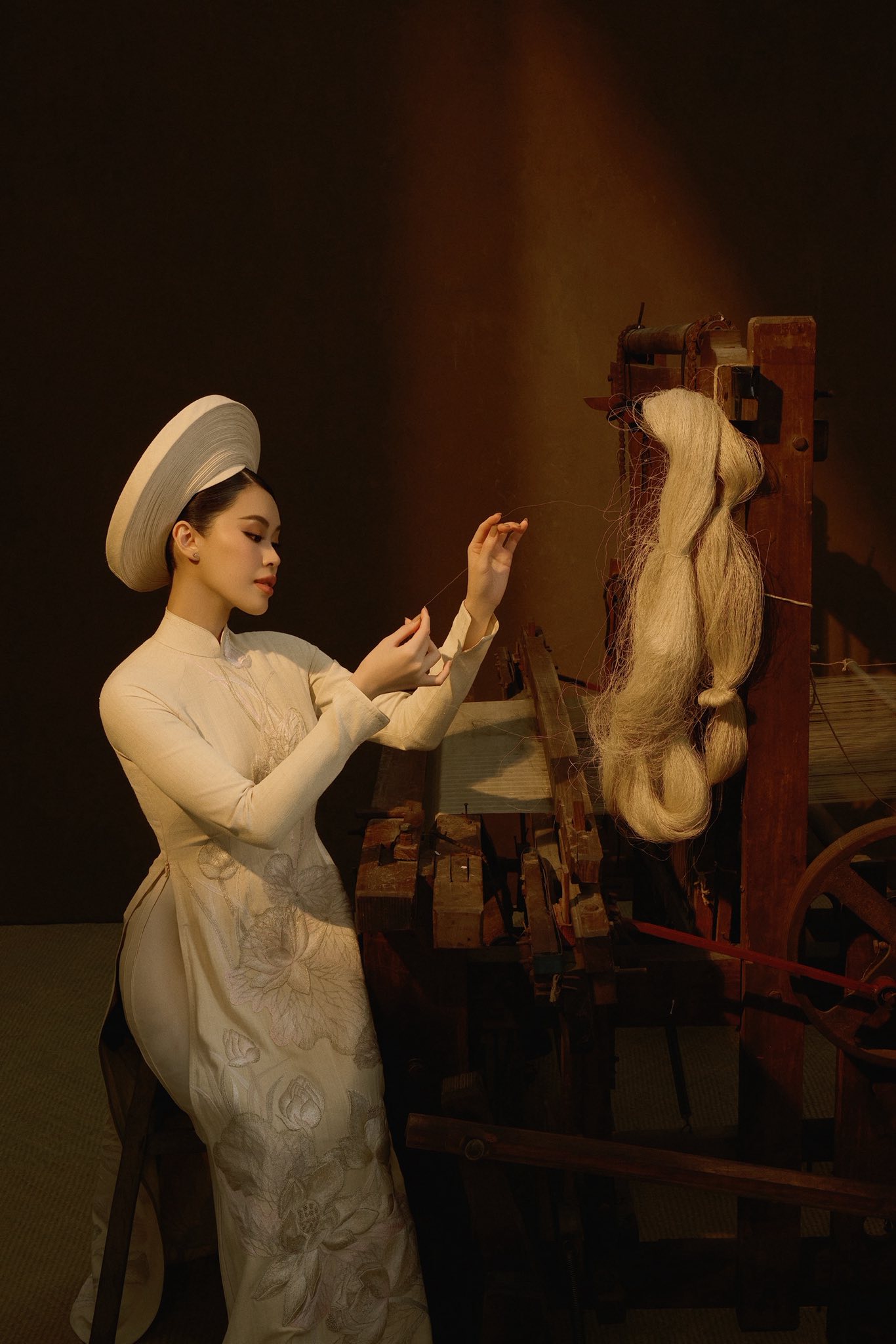They posed beside a traditional loom, a cherished family heirloom of model Vu Thu Phuong. The loom was originally located in Ninh Binh (formerly Nam Dinh), a region renowned for its long-standing silk weaving tradition. In 2023, Vu Thu Phuong transported it to Ho Chi Minh City, where it was featured on the runway during Vietnam International Fashion Week.