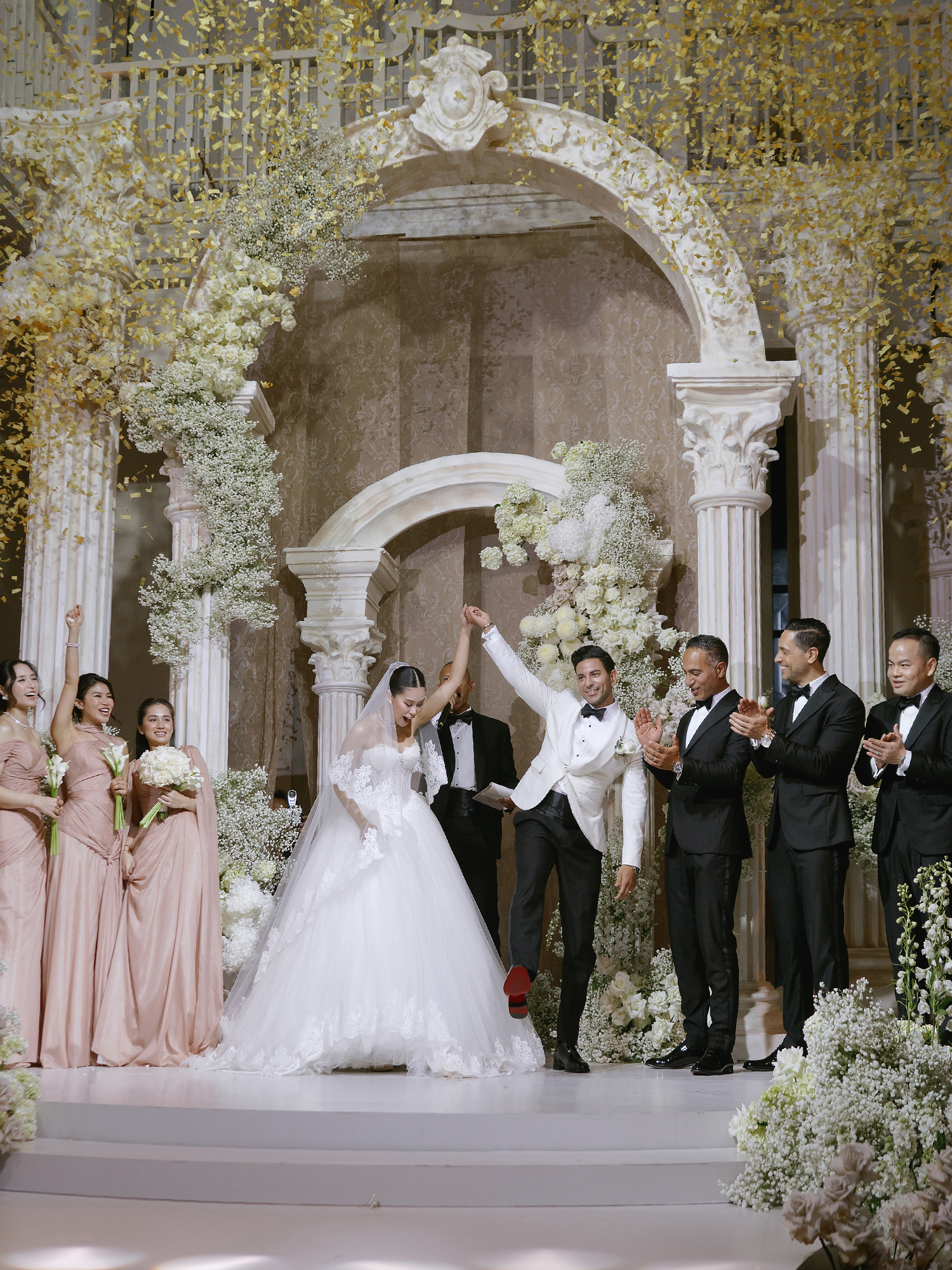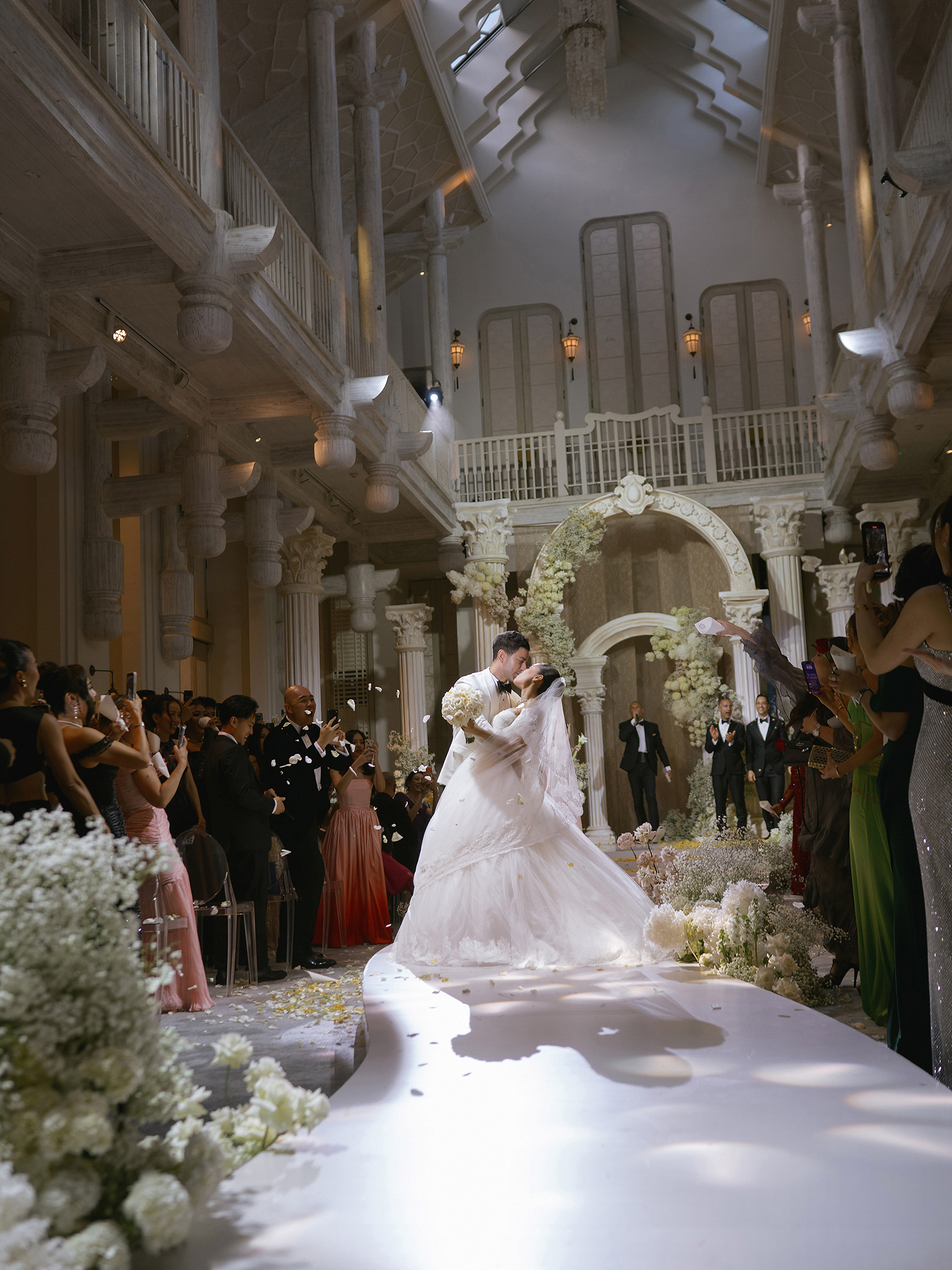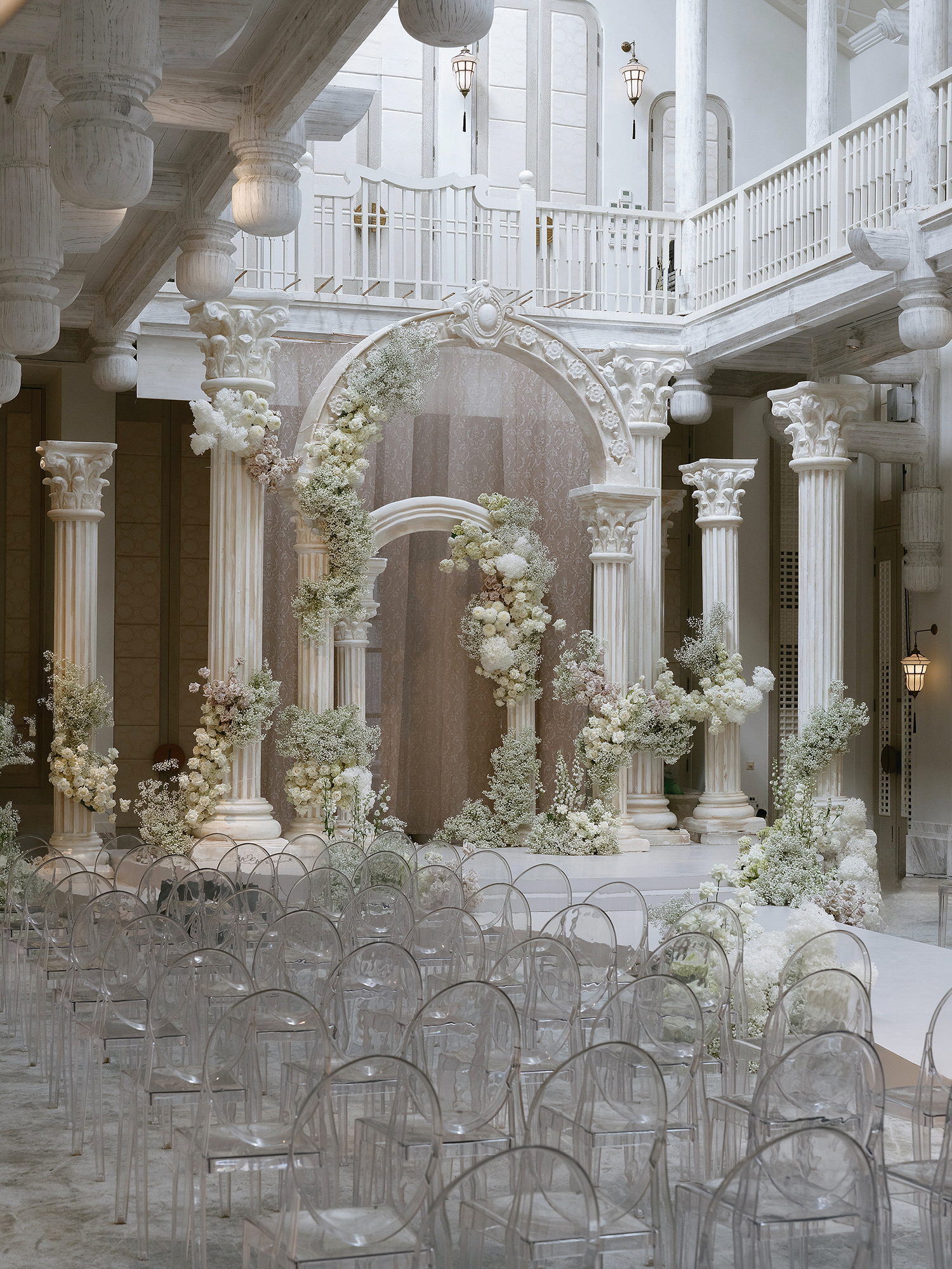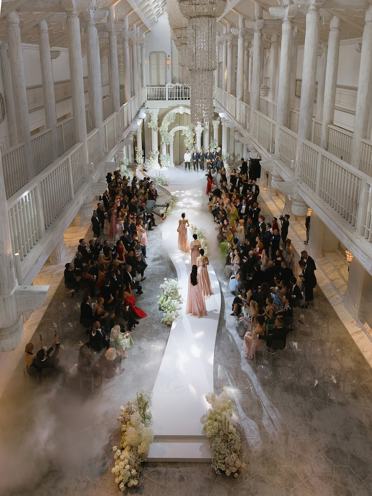 A representative for the design team stated the wedding drew inspiration from European architecture and the allure of old Hollywood, reflected in both the architectural space and guest attire.