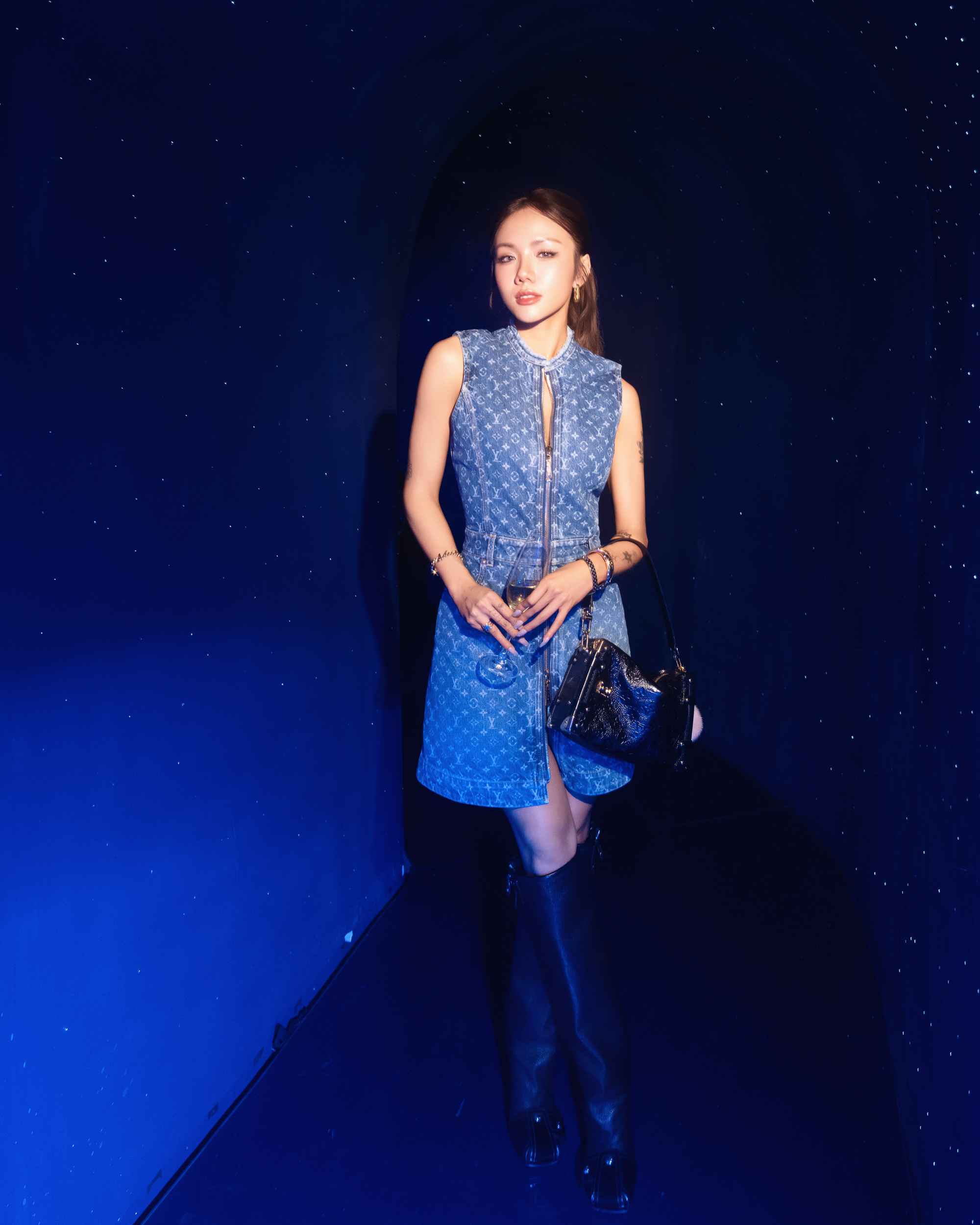 Singer Phuong Ly combined a denim dress with high-cut leather boots.
