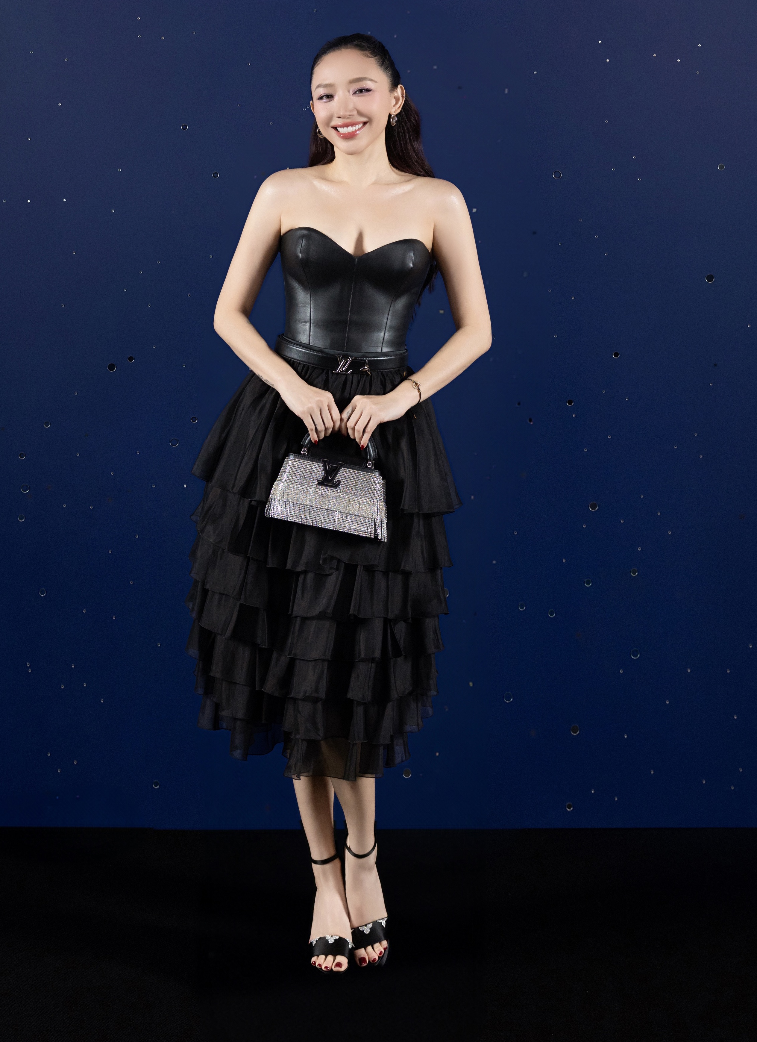 Attending the star-studded event, Toc Tien made an impression with an outfit blending edgy leather and layered chiffon. The bustier, cinched-waist dress accentuated her figure. She accessorized with a shimmering fringed Louis Vuitton Capucines bag, adding a highlight to her look.