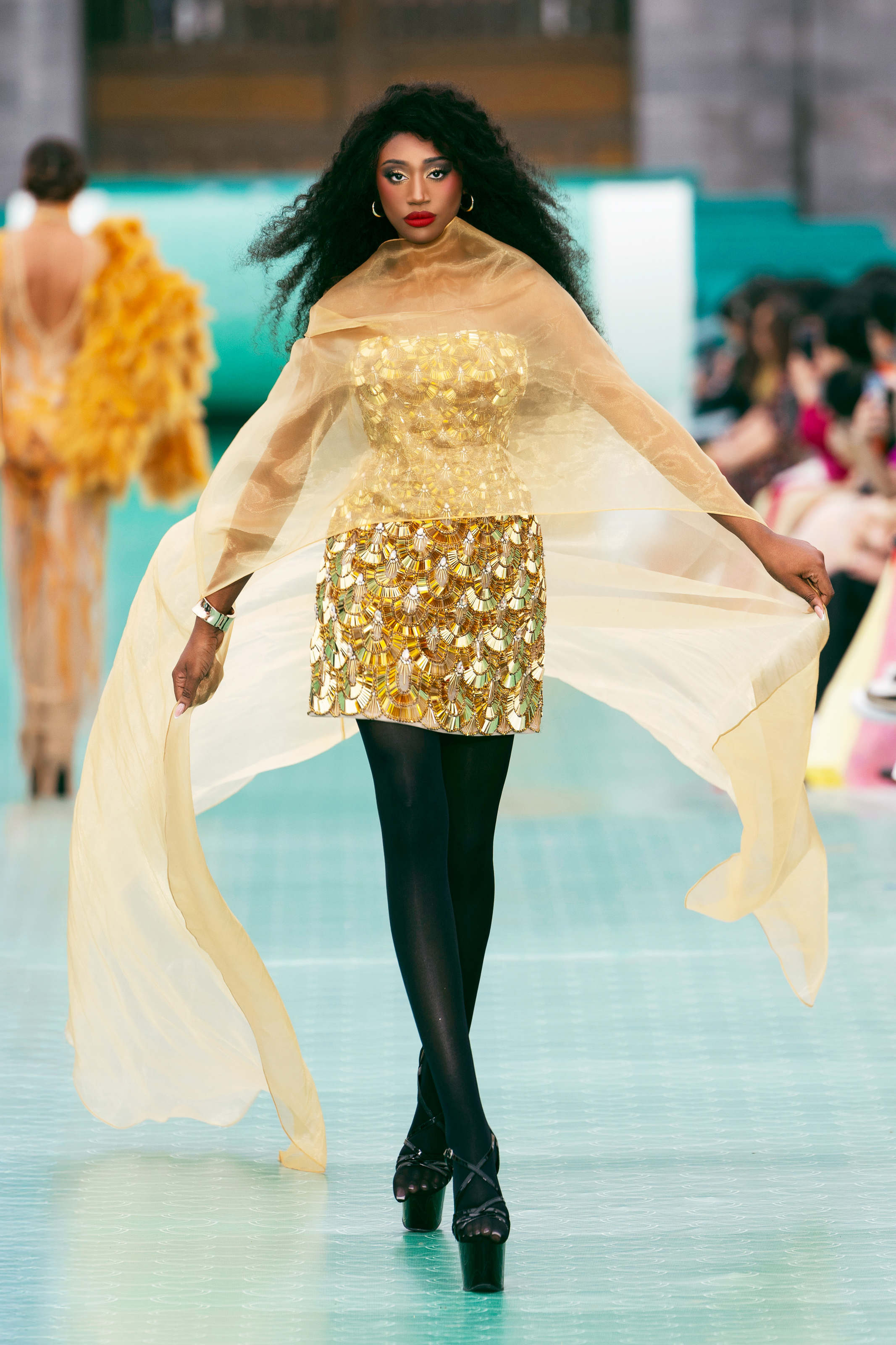 Gabriela Borges, from Brazil, walked the runway in a mesh outfit paired with a fur coat.