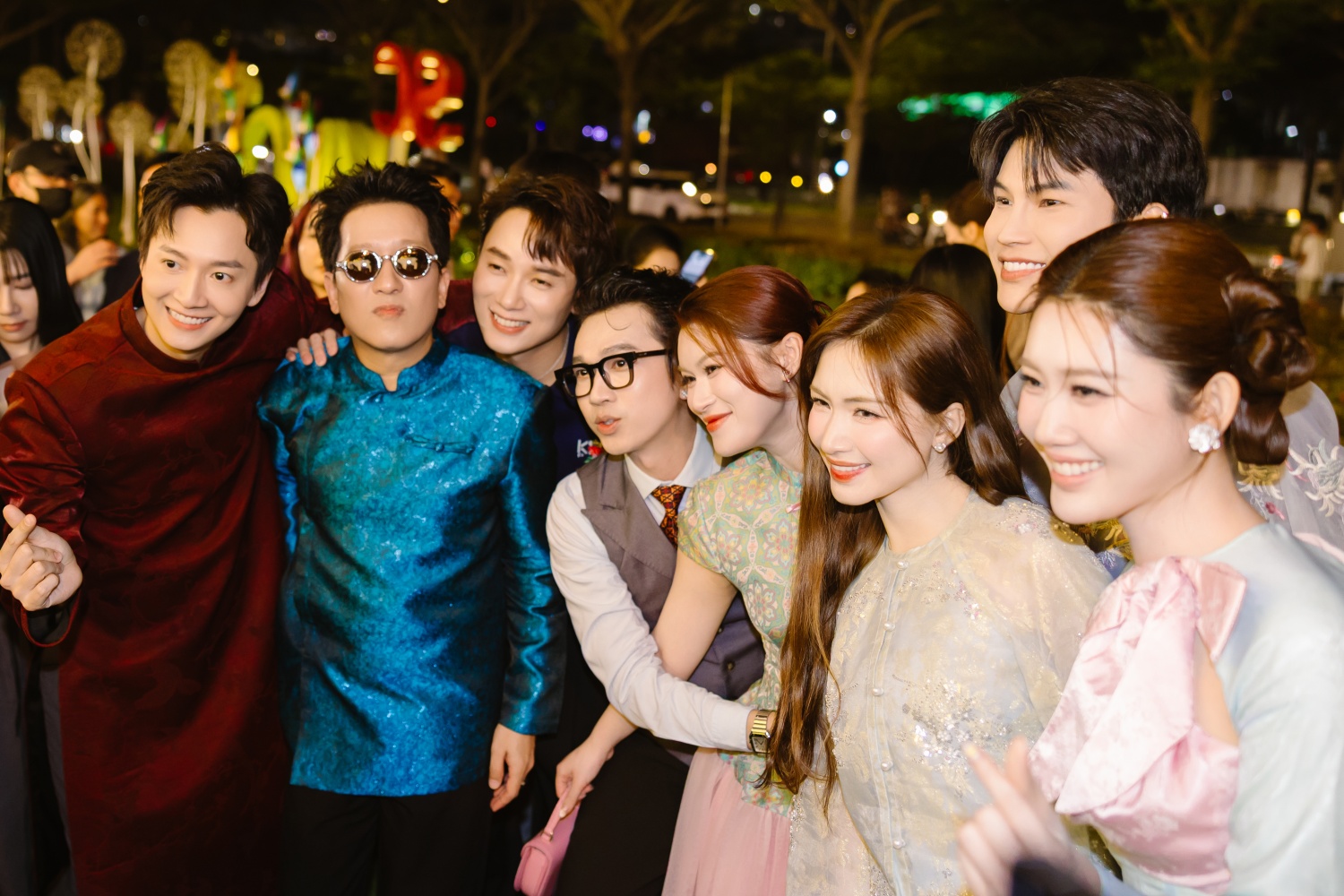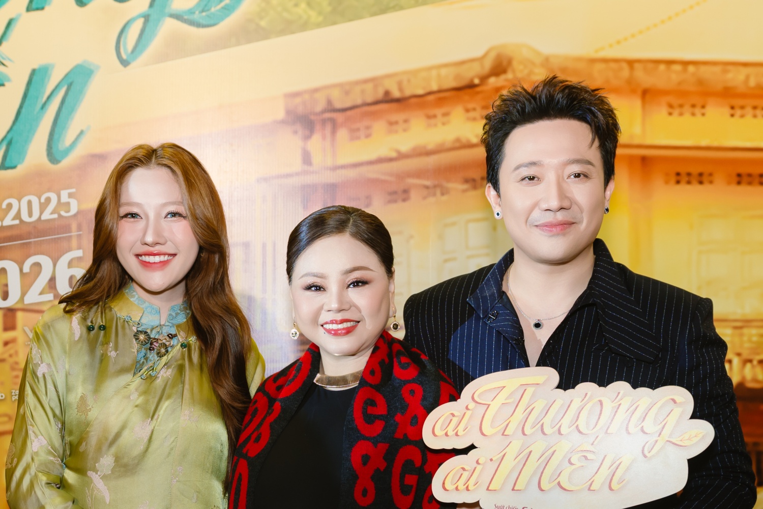 From right: producer and director Tran Thanh, artist Le Giang, and his younger sister, actress Uyen An. Tran Thanh and other stars supported Thu Trang's second film as director.