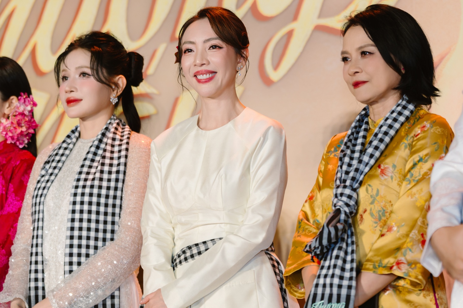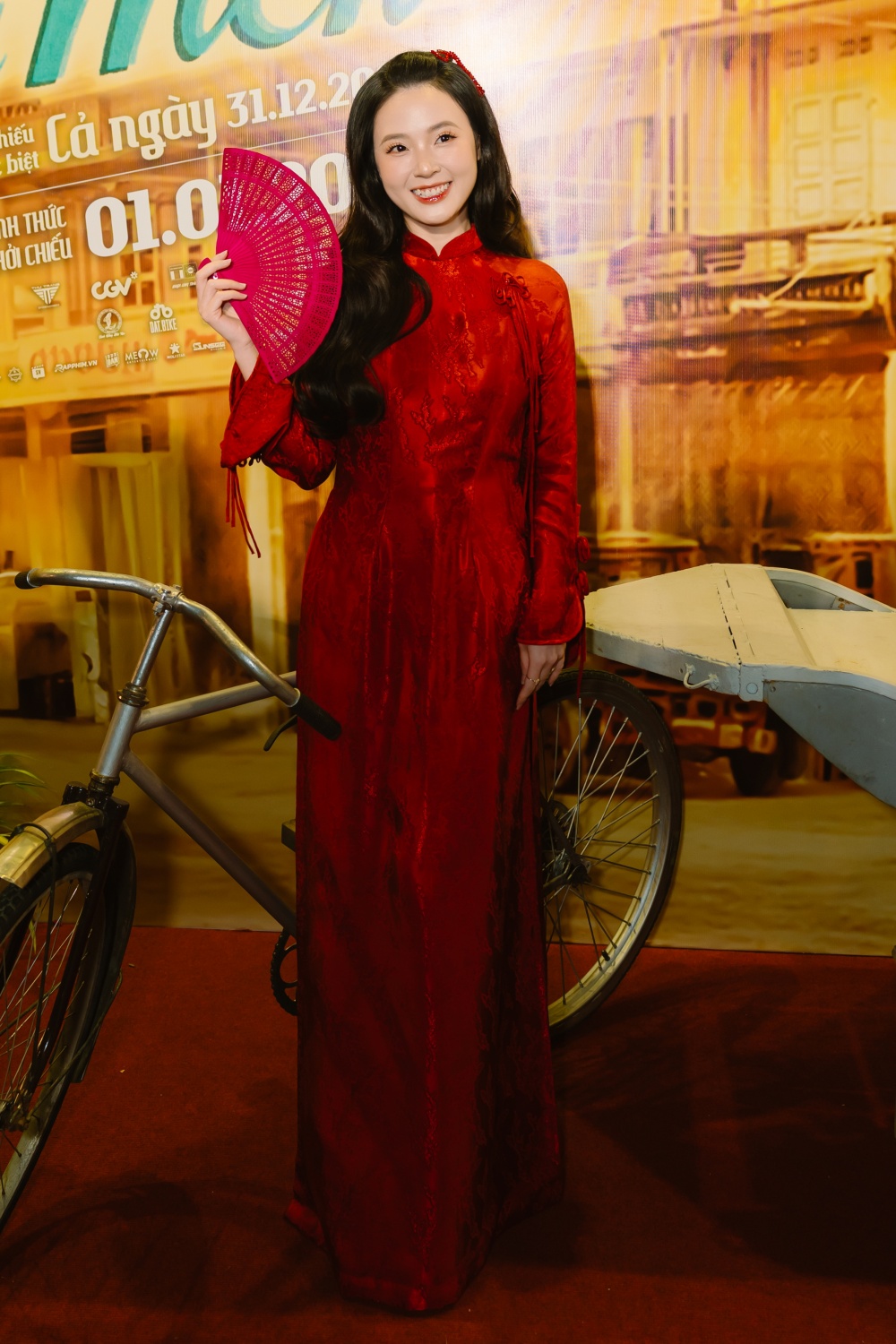 Actress Thuy Ngan (left) and Huynh Lap (right) wore modernized ao dai to match the film's theme.