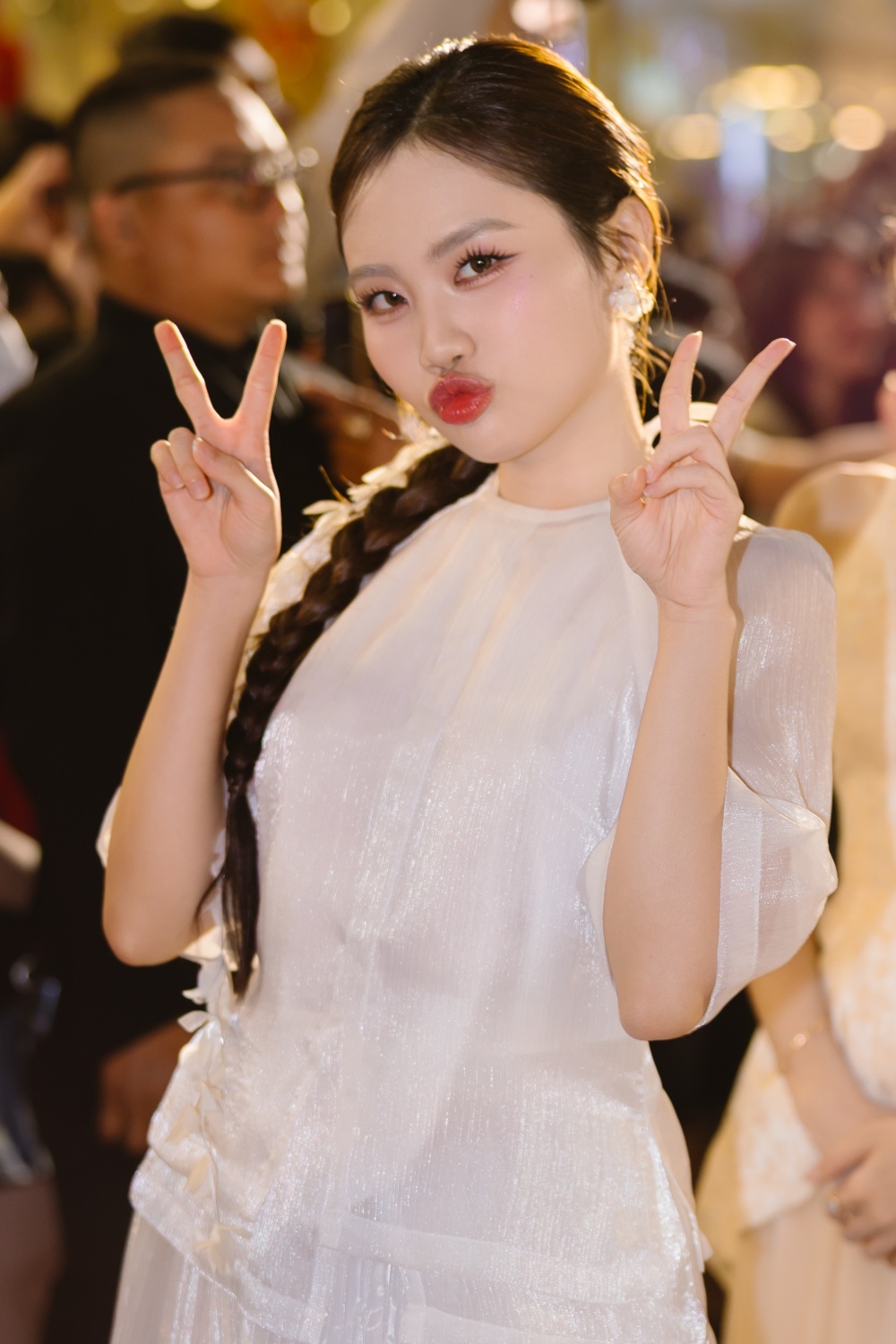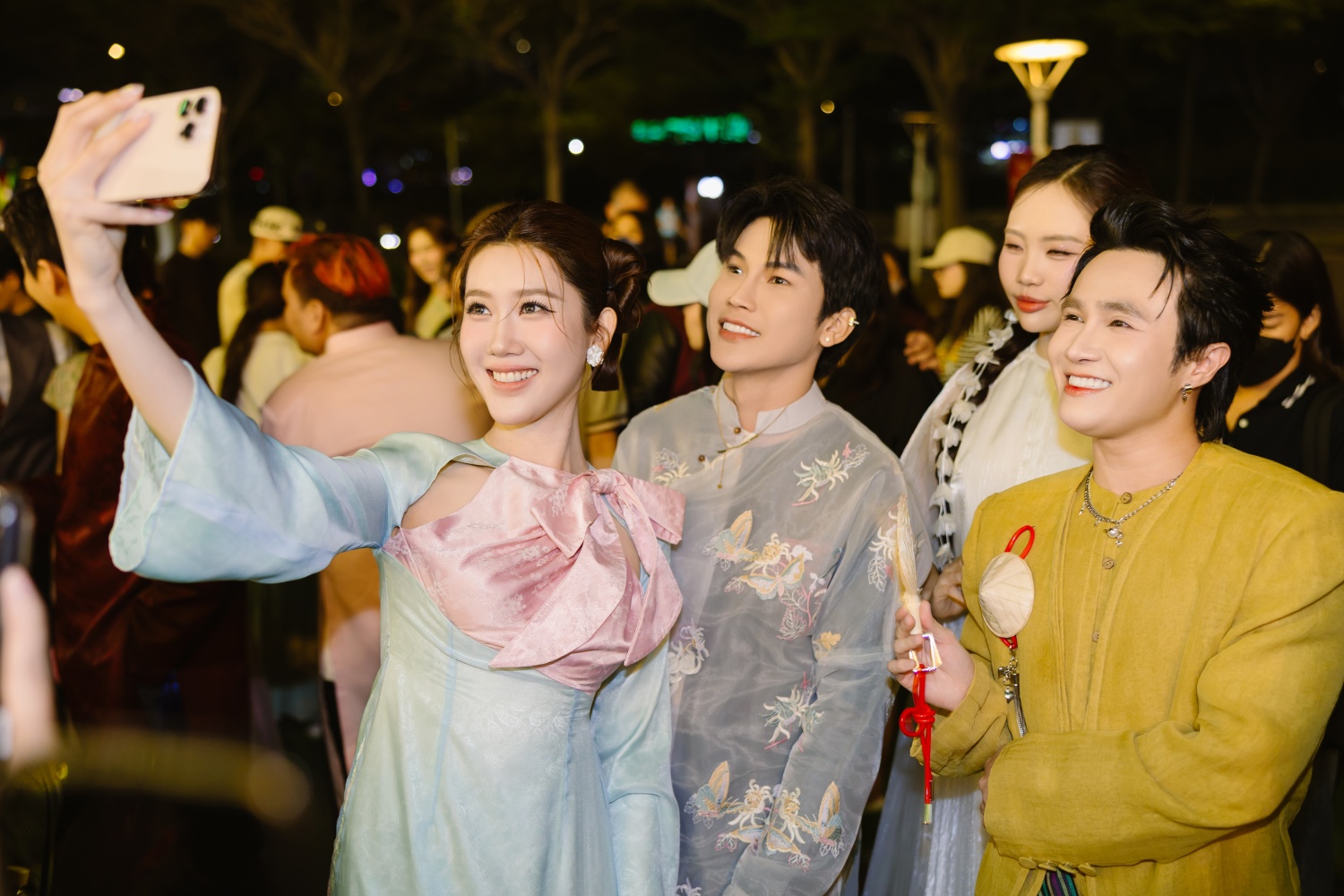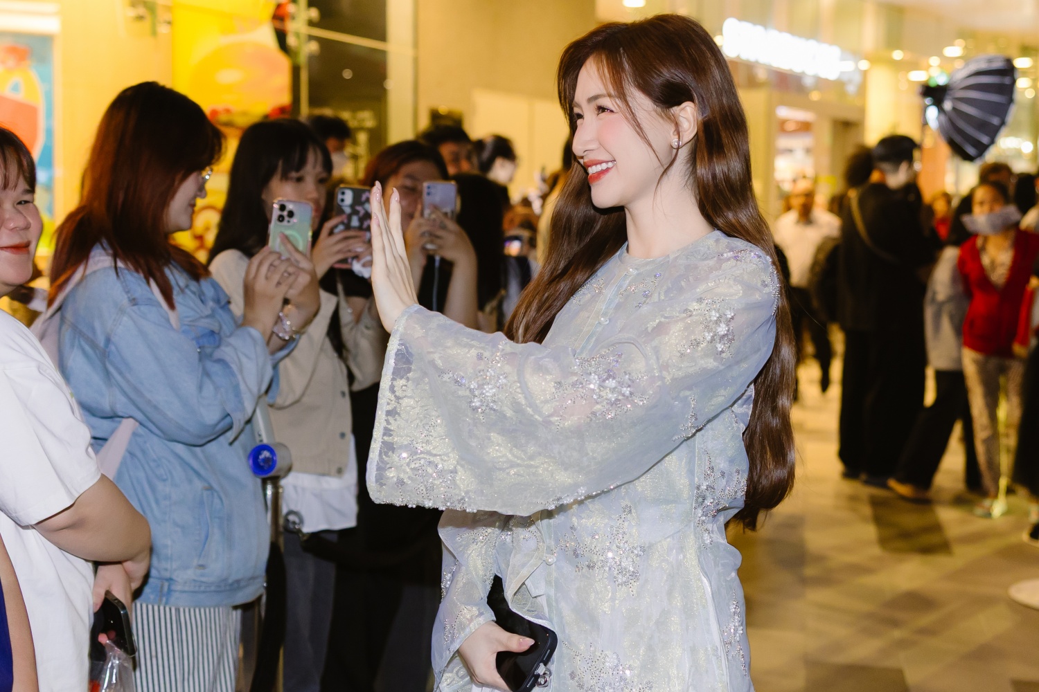 Singer Hoa Minzy was greeted by fans. This year, she achieved success with two hit songs, "Bac Bling" and "Giua noi dau hoa binh", receiving nominations for multiple awards.