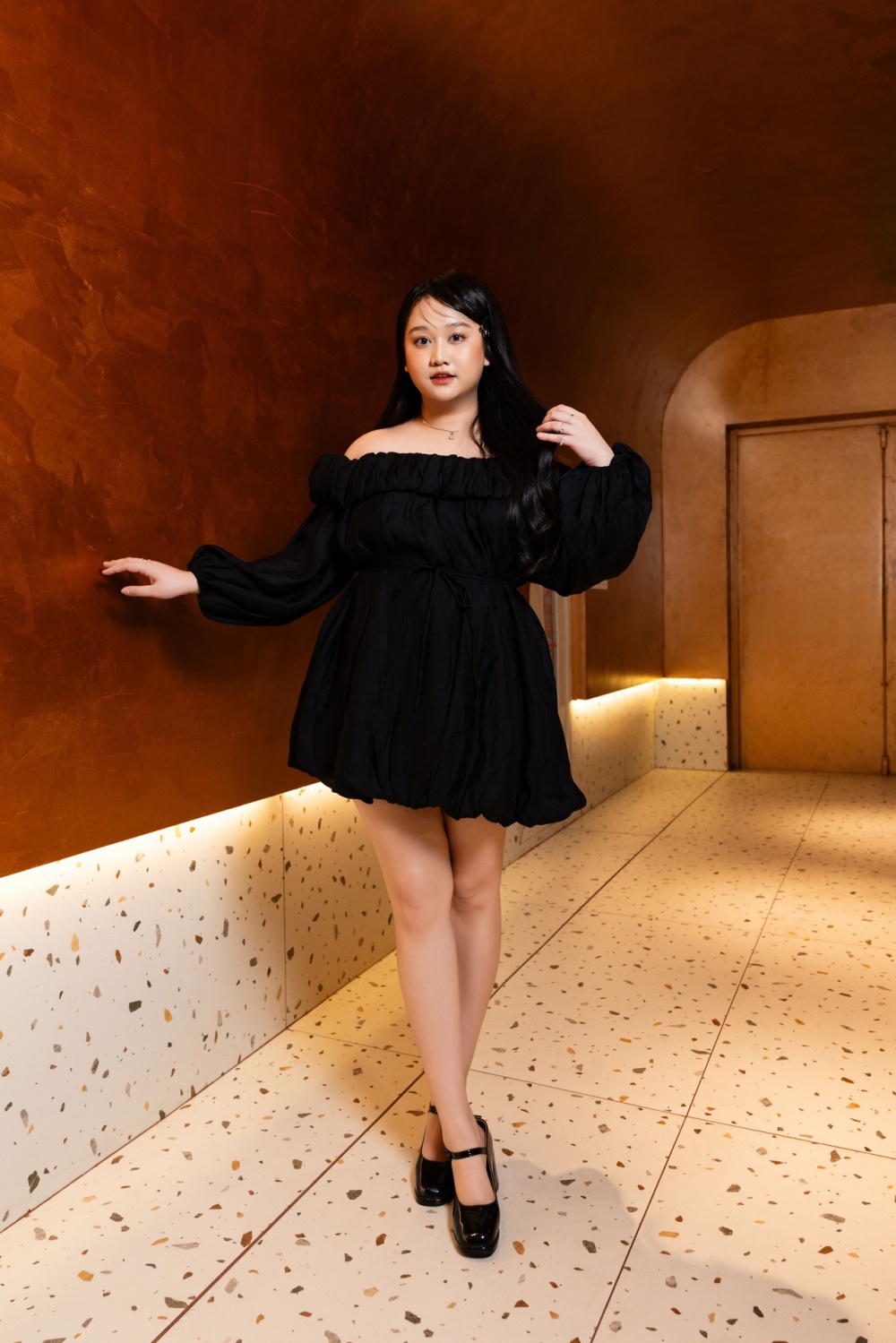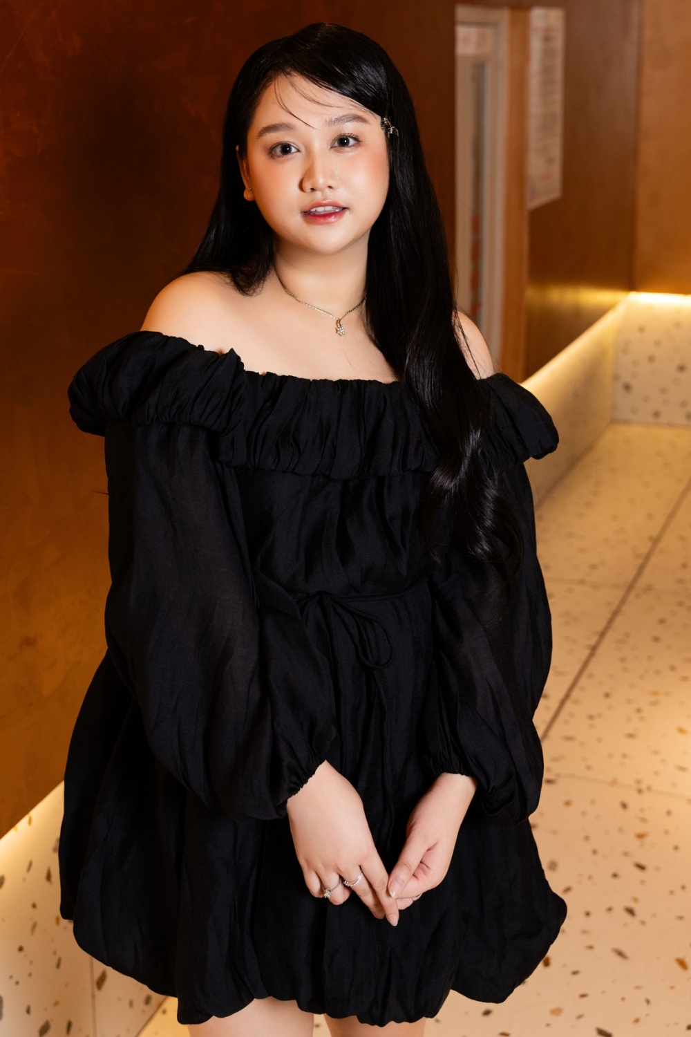 The actress paired the loose-fitting dress with matching high heels. Truc Anh revealed that last year, she experienced uncontrolled weight gain due to medication for an emotional disorder. After sharing her health struggles, she received widespread support. Following nearly a year of exercise and treatment, she went from over 80 kg to about 70 kg. Her health is now stable, and she is gradually returning to work.