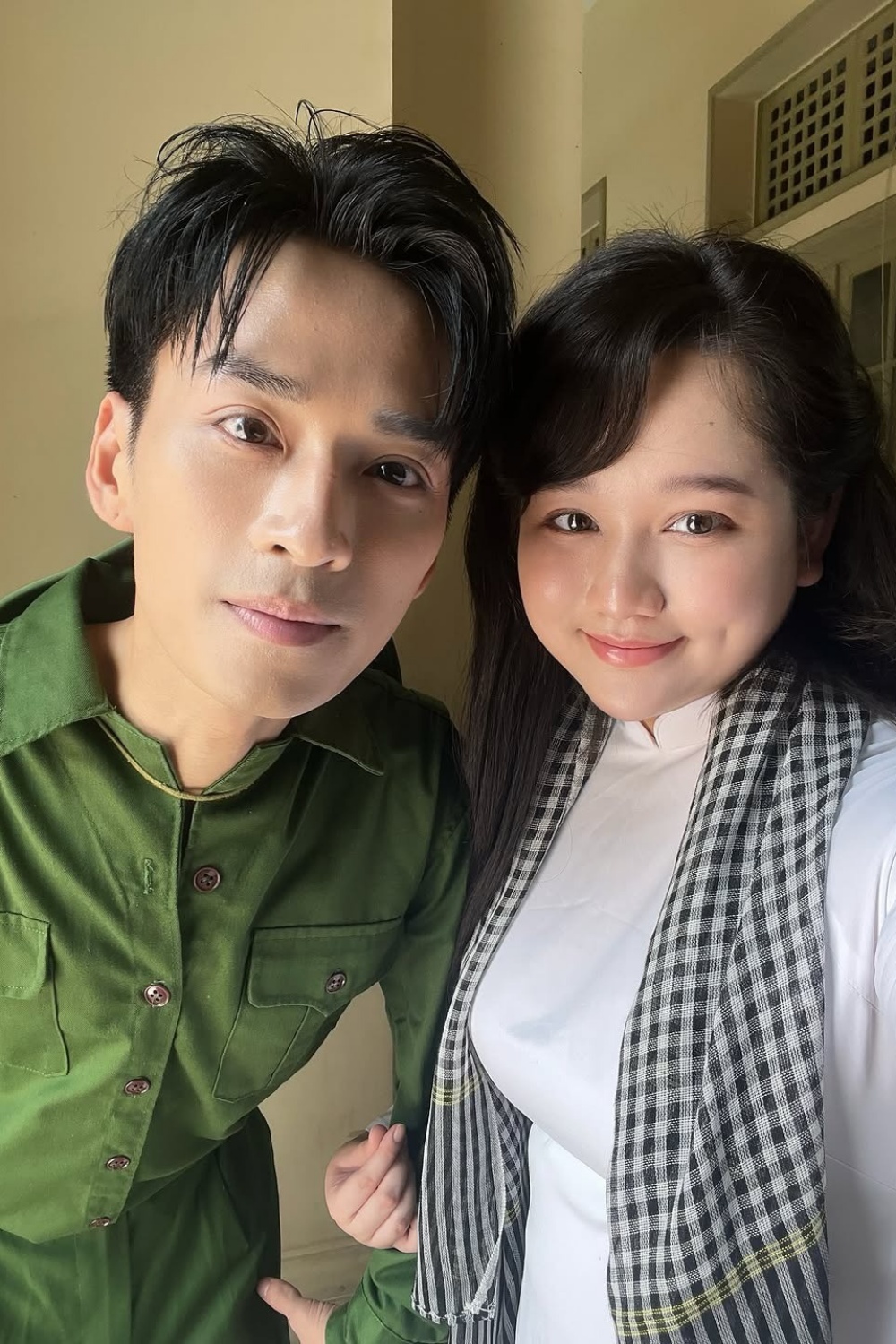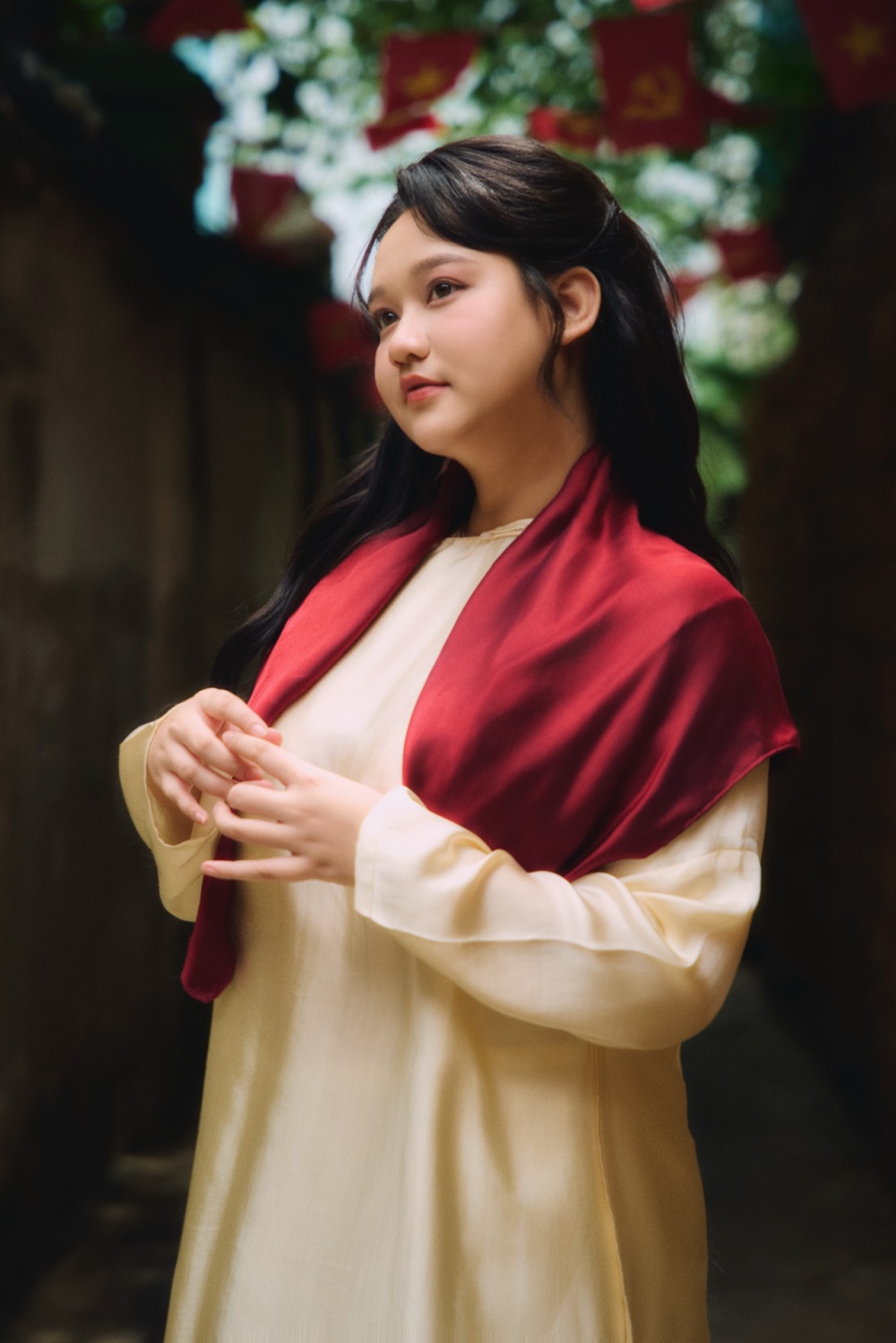 Earlier in September, the actress reunited with Tran Nghia, who played Ngan in "Mat Biec", after six years. She chose a white ao dai (traditional Vietnamese dress) with a checkered scarf to celebrate the 80th National Day with her former co-star. |