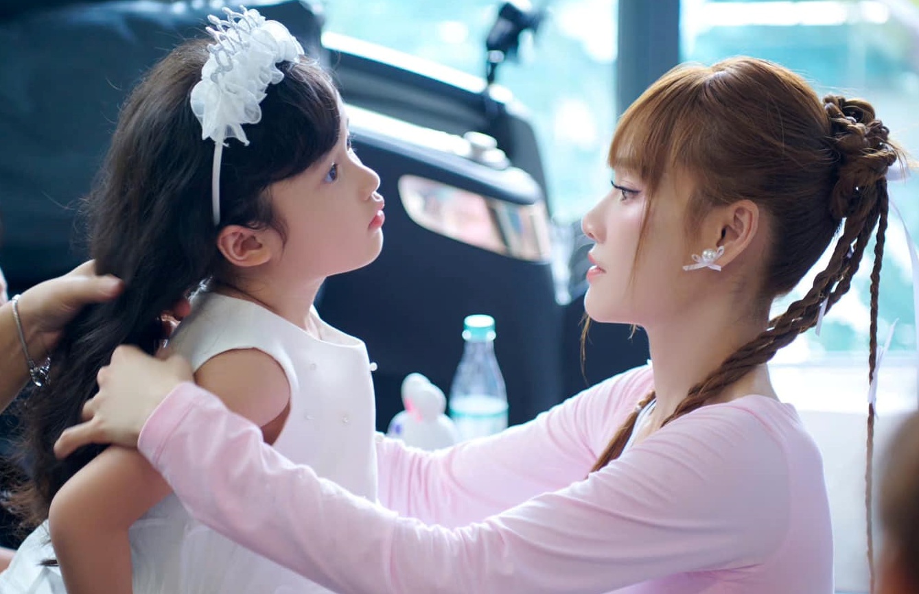 Nha Phuong and her daughter coordinate outfits and take photos at home.
